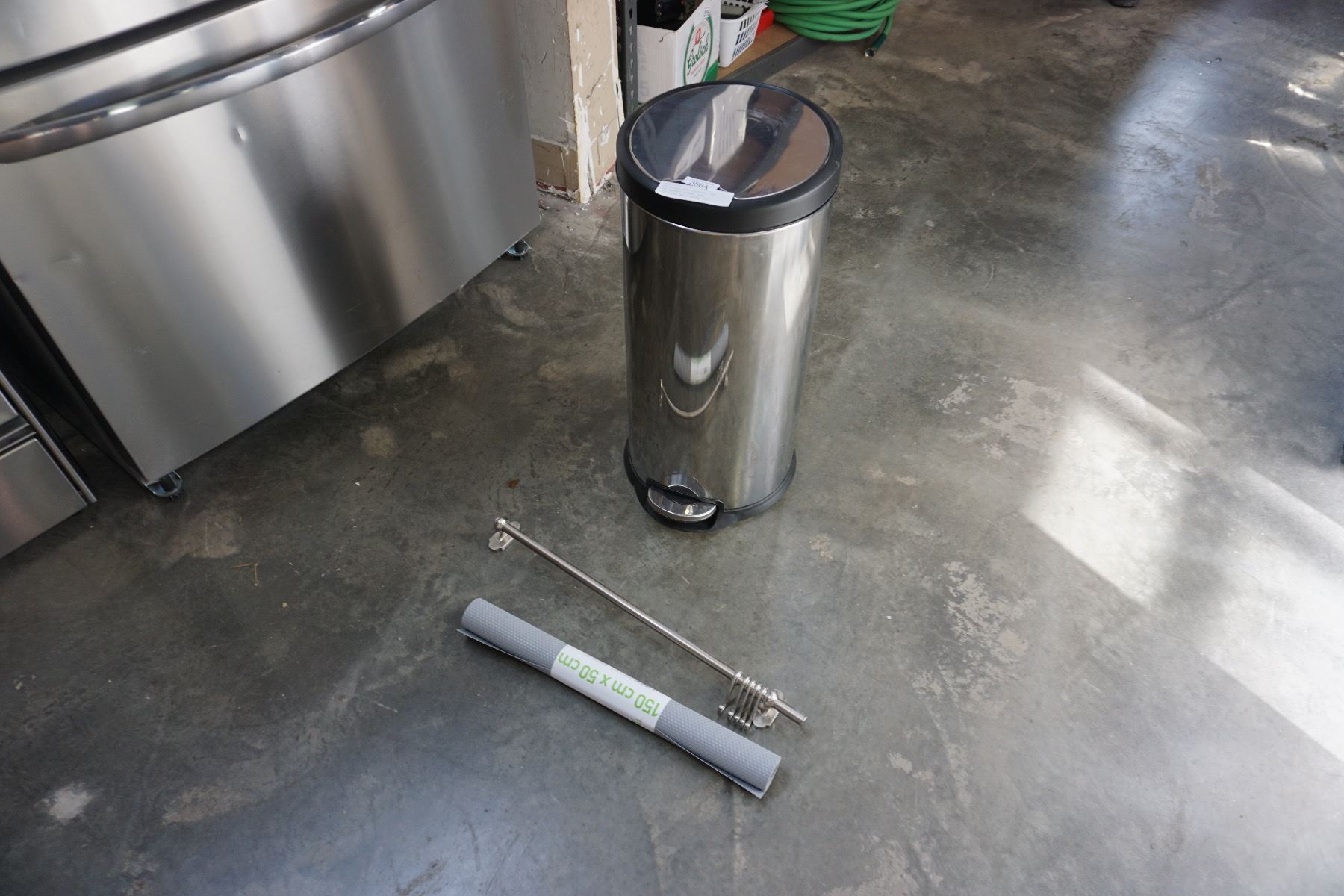 STAINLESS STEP GARBAGE CAN, NEW DRAWER LINER, AND STAINLESS WALL MOUNT CUP HANGER