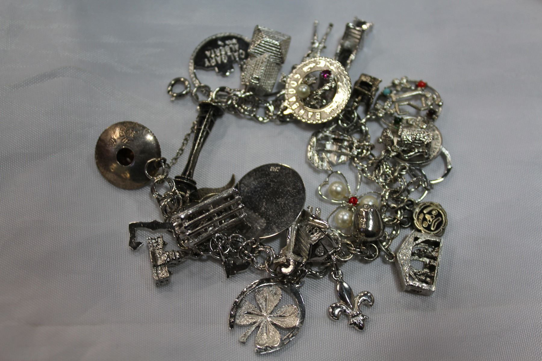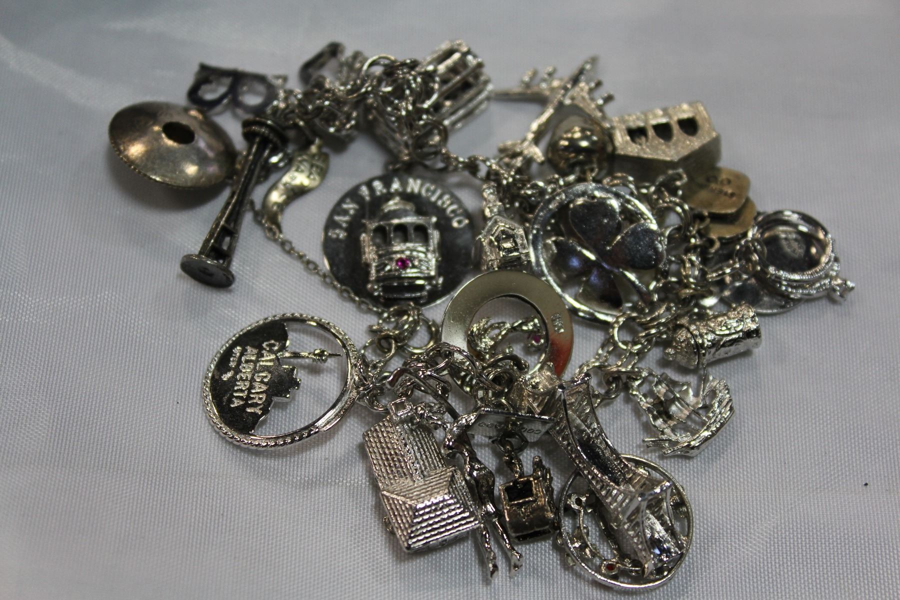 STERLING CHARM BRACELET WITH LOTS OF CHARMS