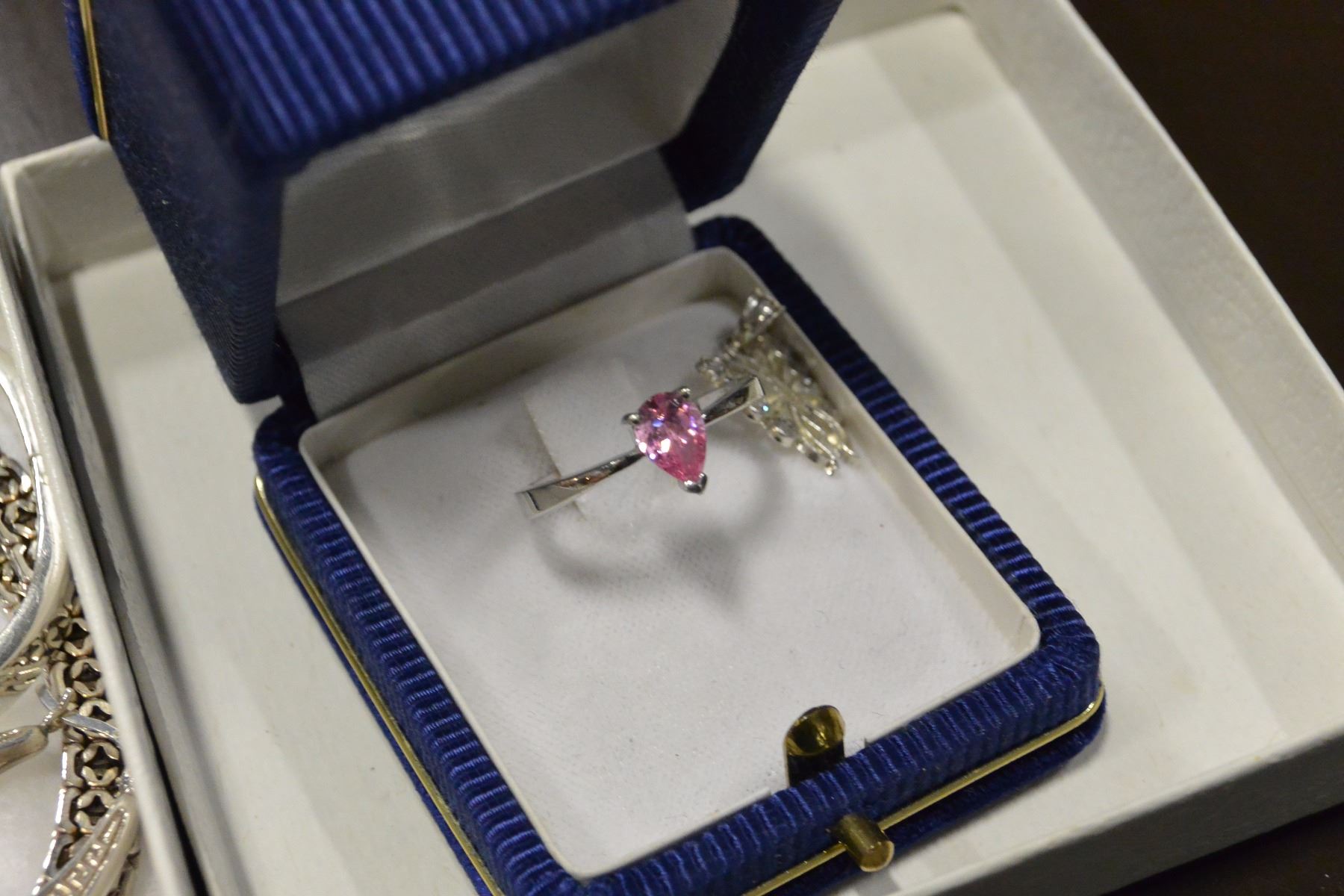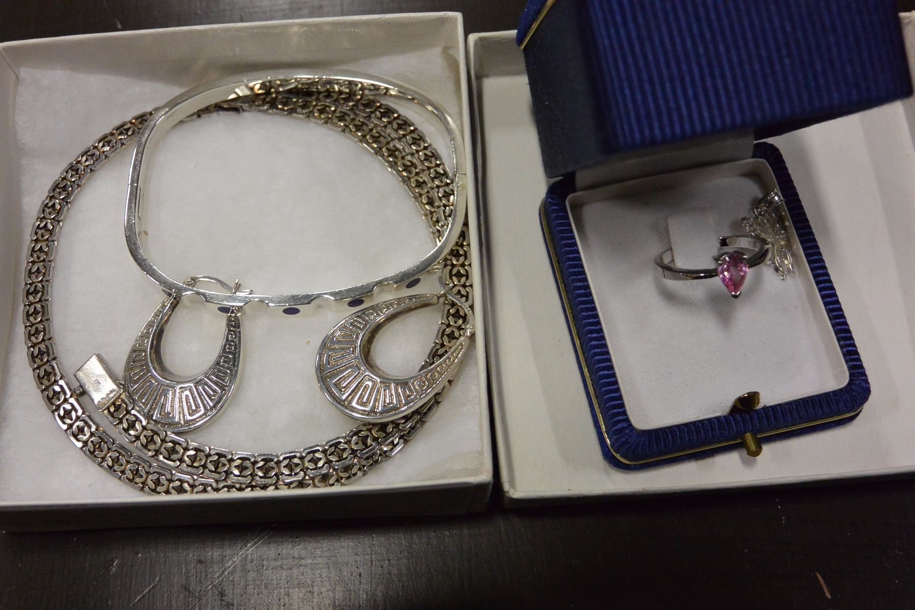 STERLING CHOKER STERLING BANGLE STERLING PINK TOPAZ RING AND EARRINGS