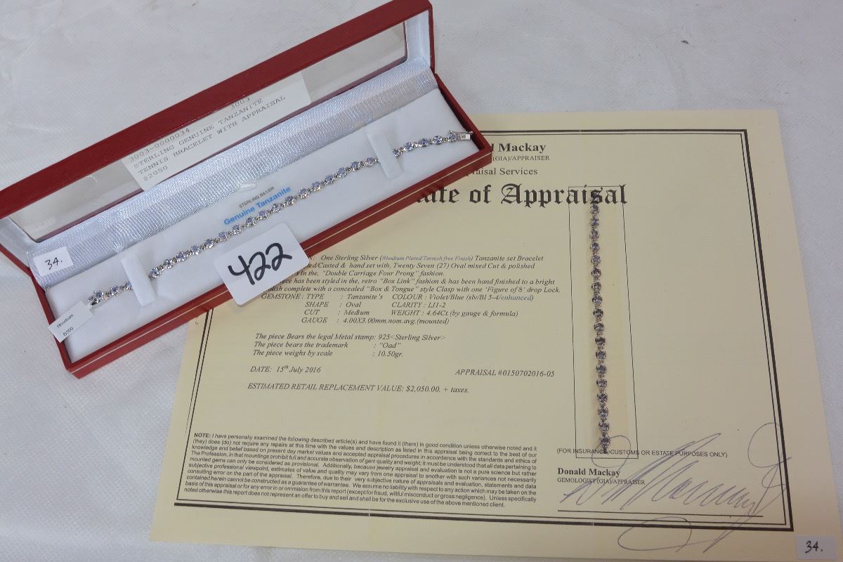 STERLING GENUINE TANZANITE TENNIS BRACELET WITH APPRAISAL