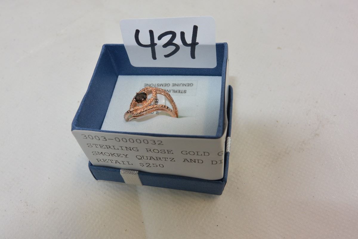 STERLING ROSE GOLD GENUINE SMOKEY QUARTZ AND DIAMOND RING