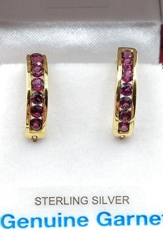STERLING SILVER 10KT GOLD PLATED HOOPS SET W/ 14 NATURAL ALMONDITE GARNETS W/ APPRAISAL $860