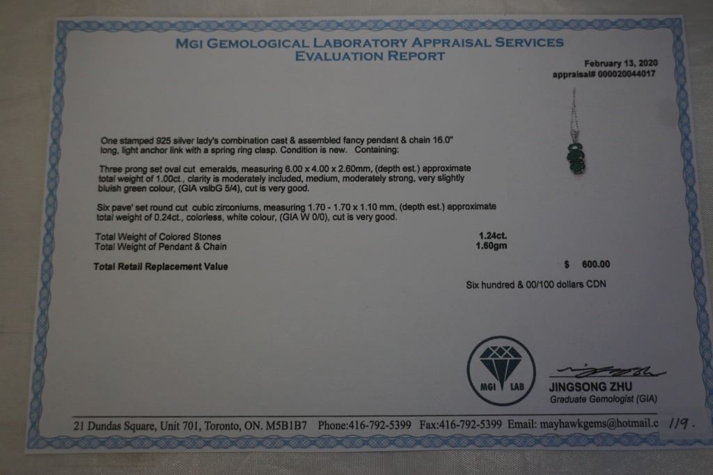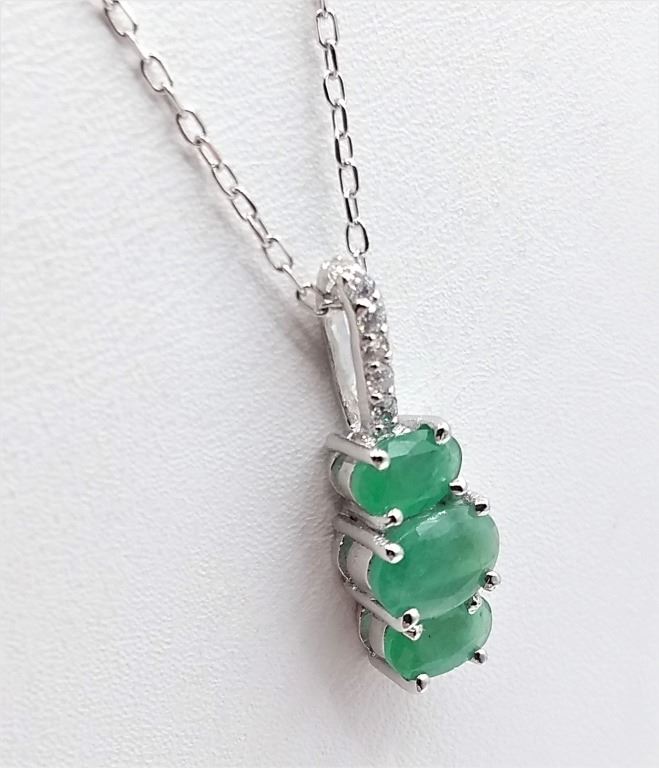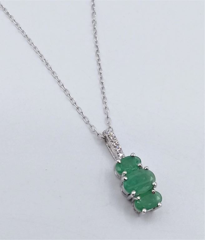 STERLING SILVER 6X4MM GENUINE EMERALD AND CZ PENDANT W/ STERLING CHAIN W/ APPRAISAL $800 - 1CT EMERALD, BIRTHSTONE MAY