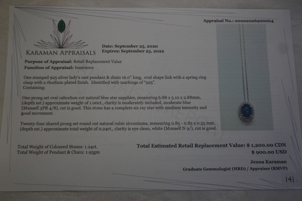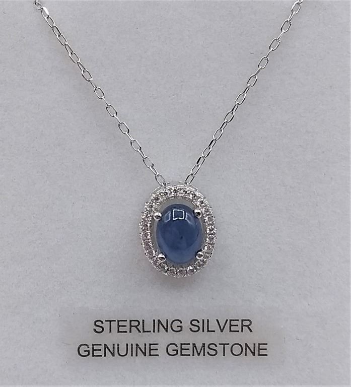 STERLING SILVER 7X5MM GENUINE BLUE SAPPHIRE AND CZ PENDANT W/ STERLING CHAIN W/ APPRAISAL $1200 - 1CT SAPPHIRE