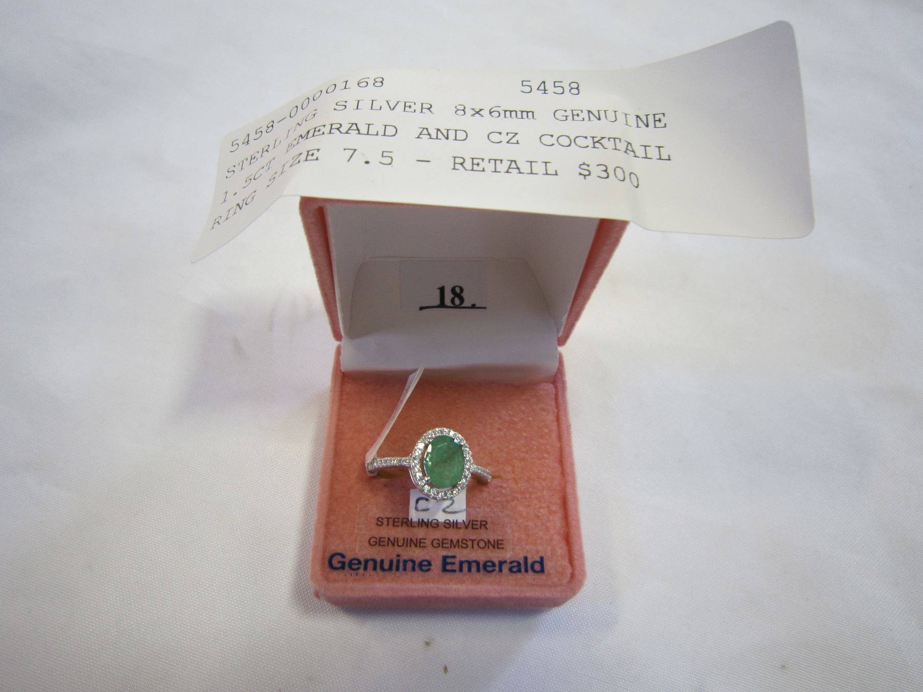 STERLING SILVER 8x6mm GENUINE 1.5CT EMERALD AND CZ COCKTAIL RING SIZE 7.5 - RETAIL $300