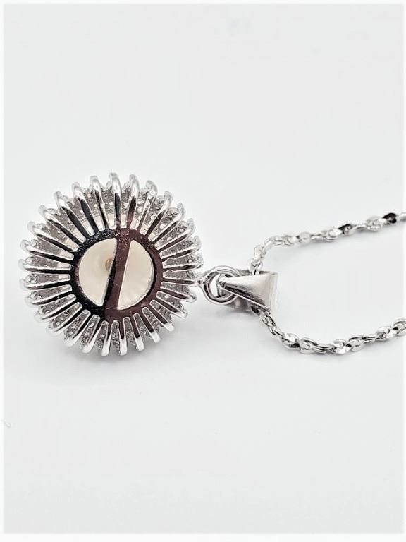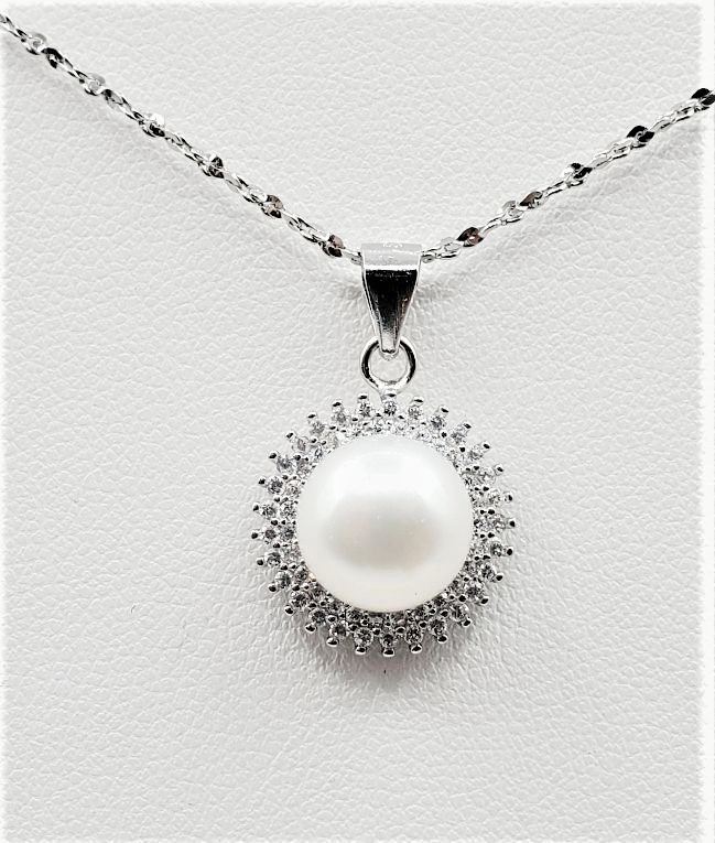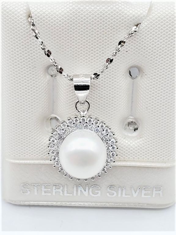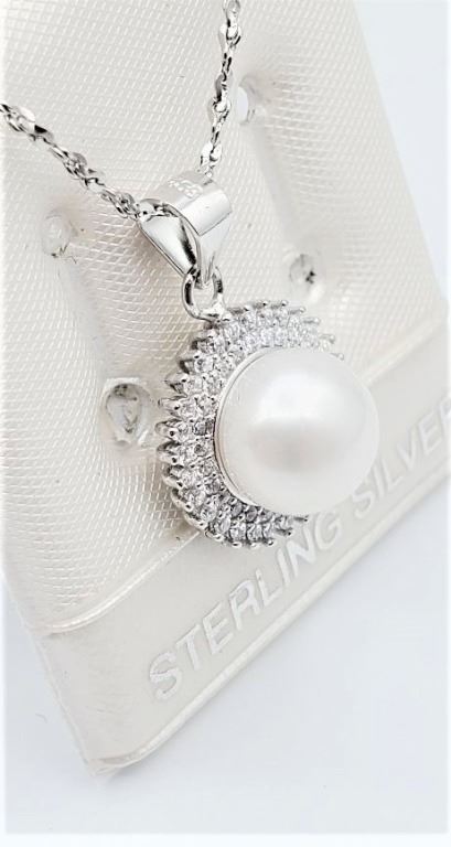 STERLING SILVER 9MM NATURAL FRESHWATER PEARL & CZ PENDANT WITH STERLING SILVER CHAIN, W/A $565.00
