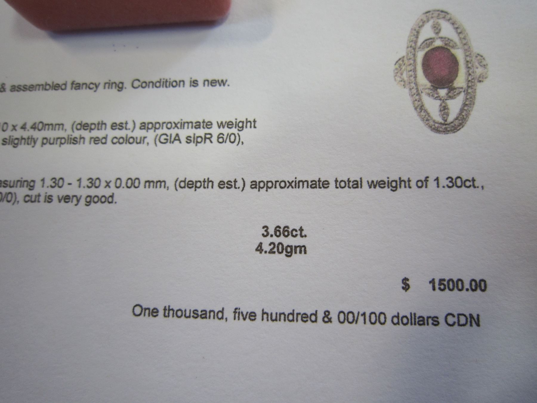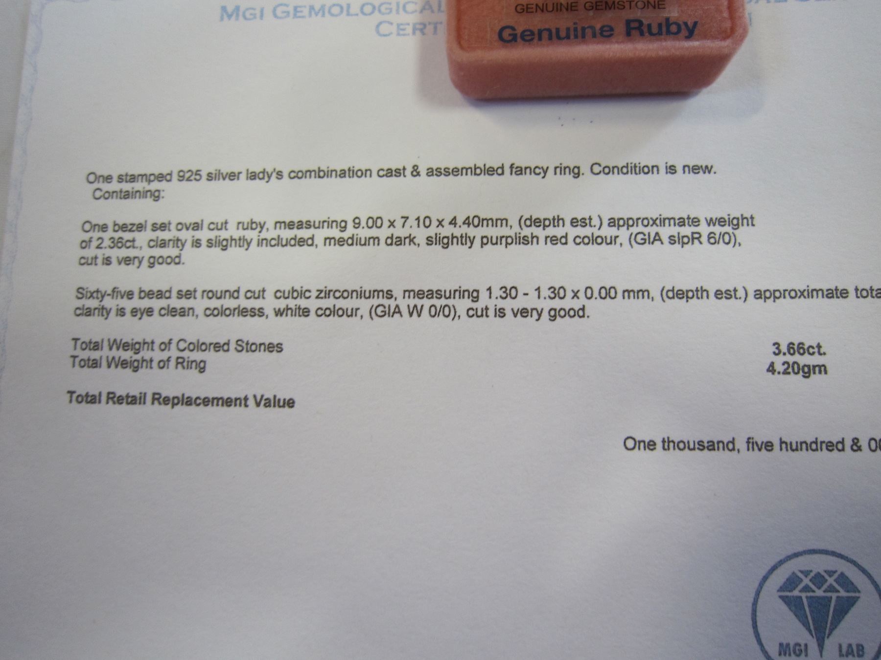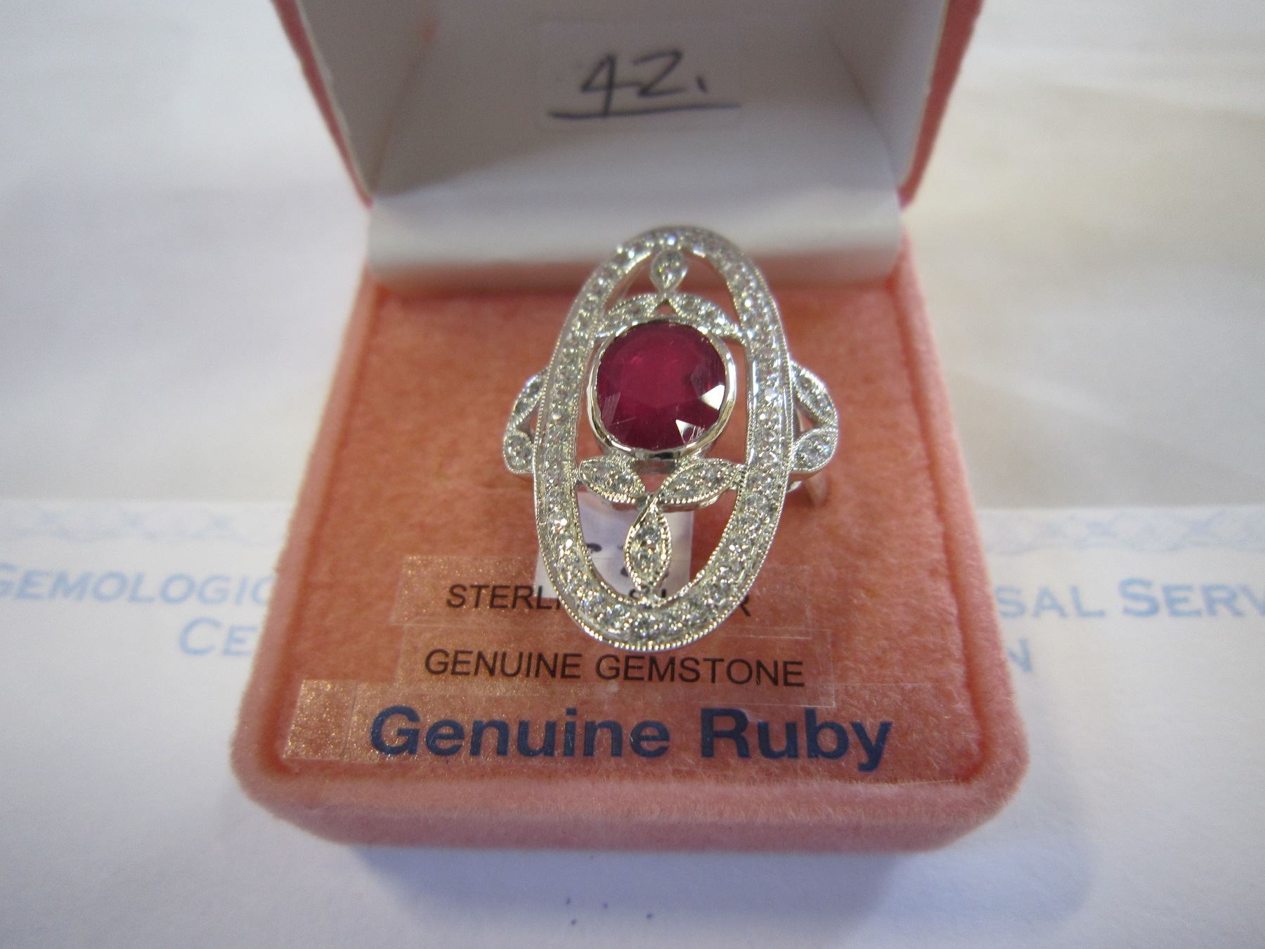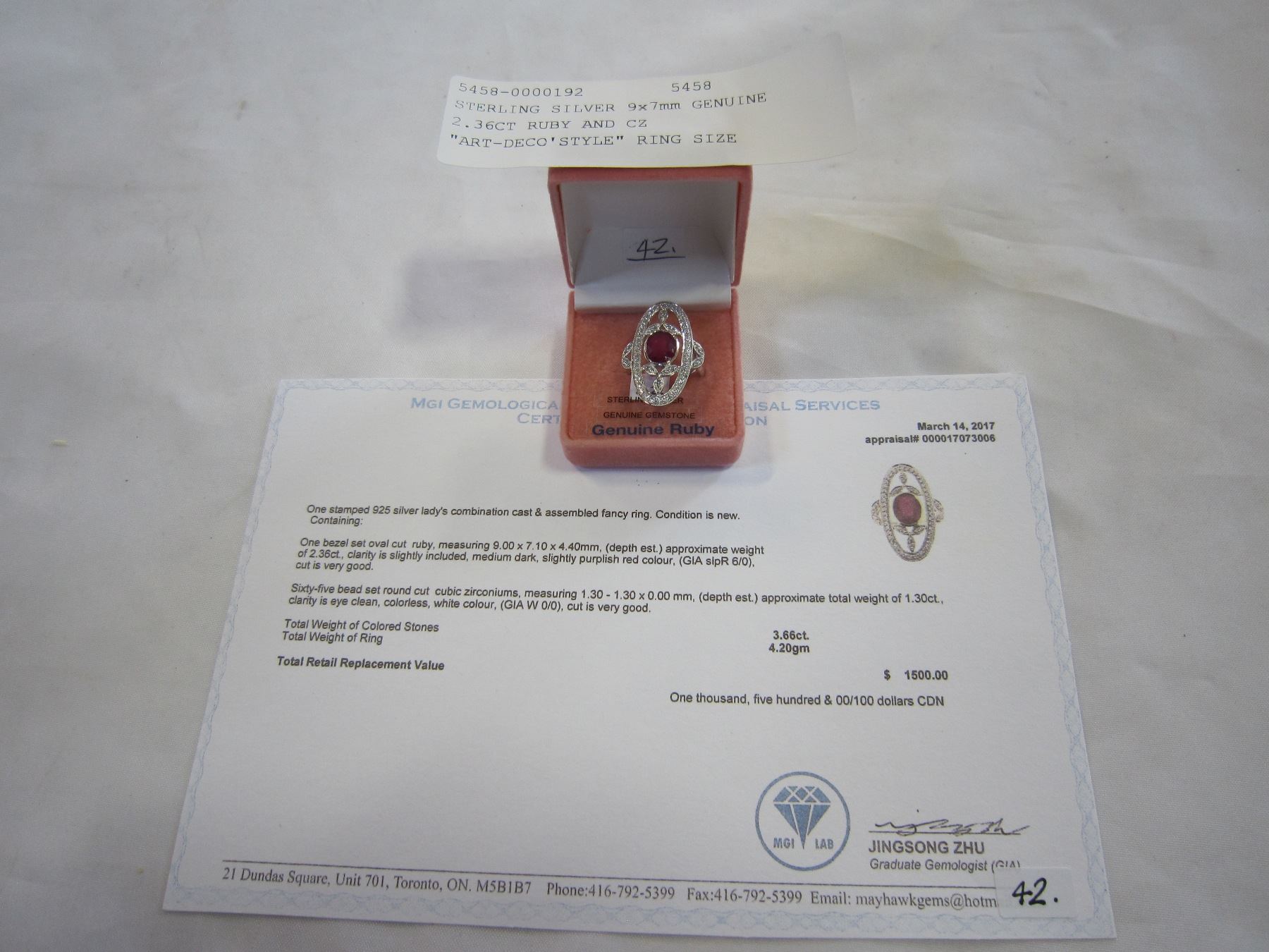 STERLING SILVER 9x7mm GENUINE 2.36CT RUBY AND CZ "ART-DECOSTYLE" RING SIZE 6.75 W/ APPRAISAL $1500