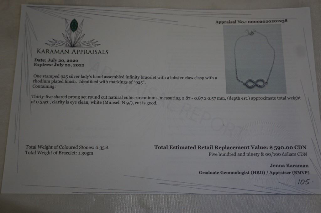 STERLING SILVER CZ "INFINITY" STYLE BRACELET W/ APPRAISAL $590