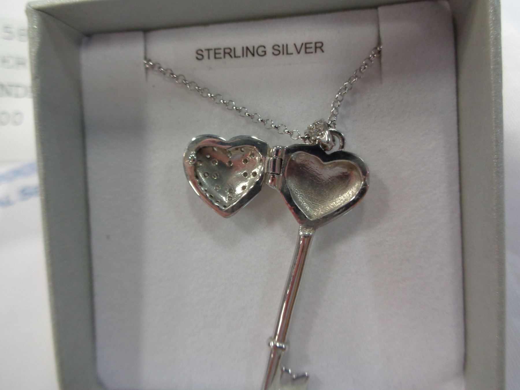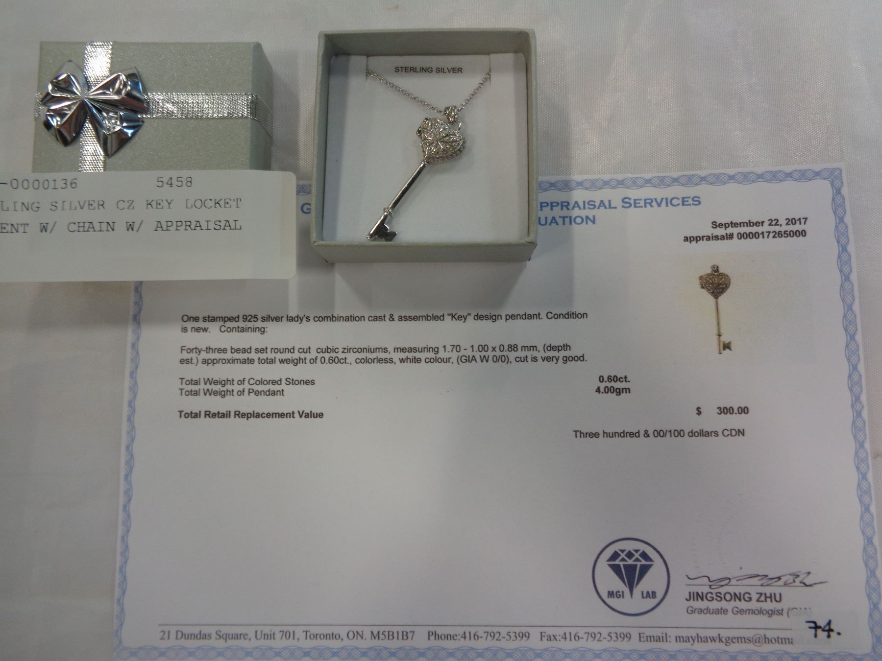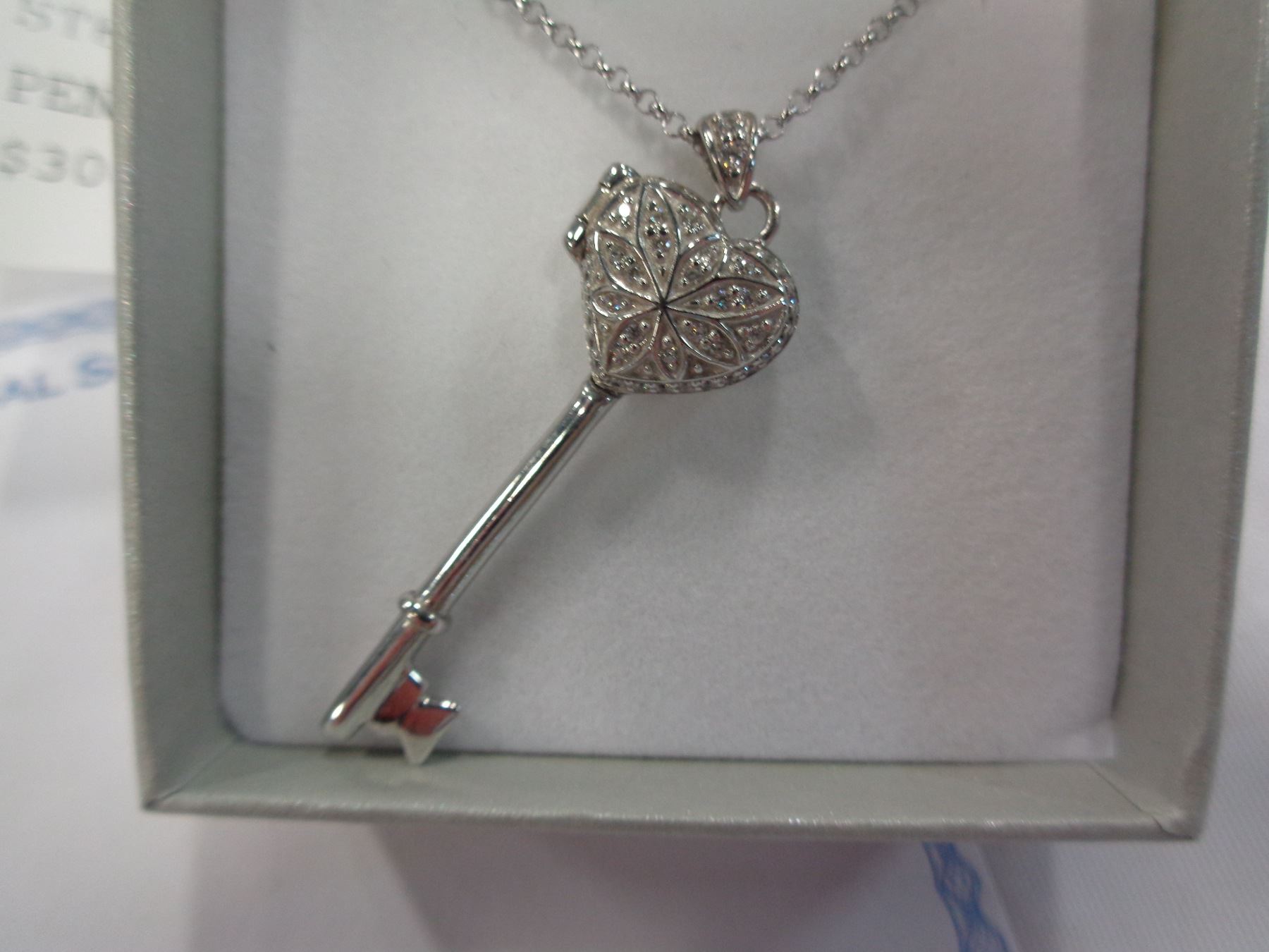 STERLING SILVER CZ KEY LOCKET PENDENT W/ CHAIN W/ APPRAISAL $300