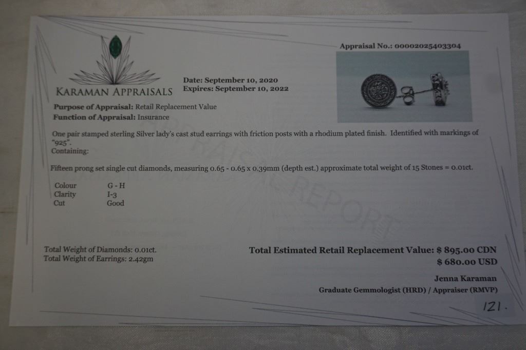STERLING SILVER DIAMOND EARRINGS W/ APPRIASAL $895 - 15 DIAMONDS (0.01CT) BIRTHSTONE APRIL