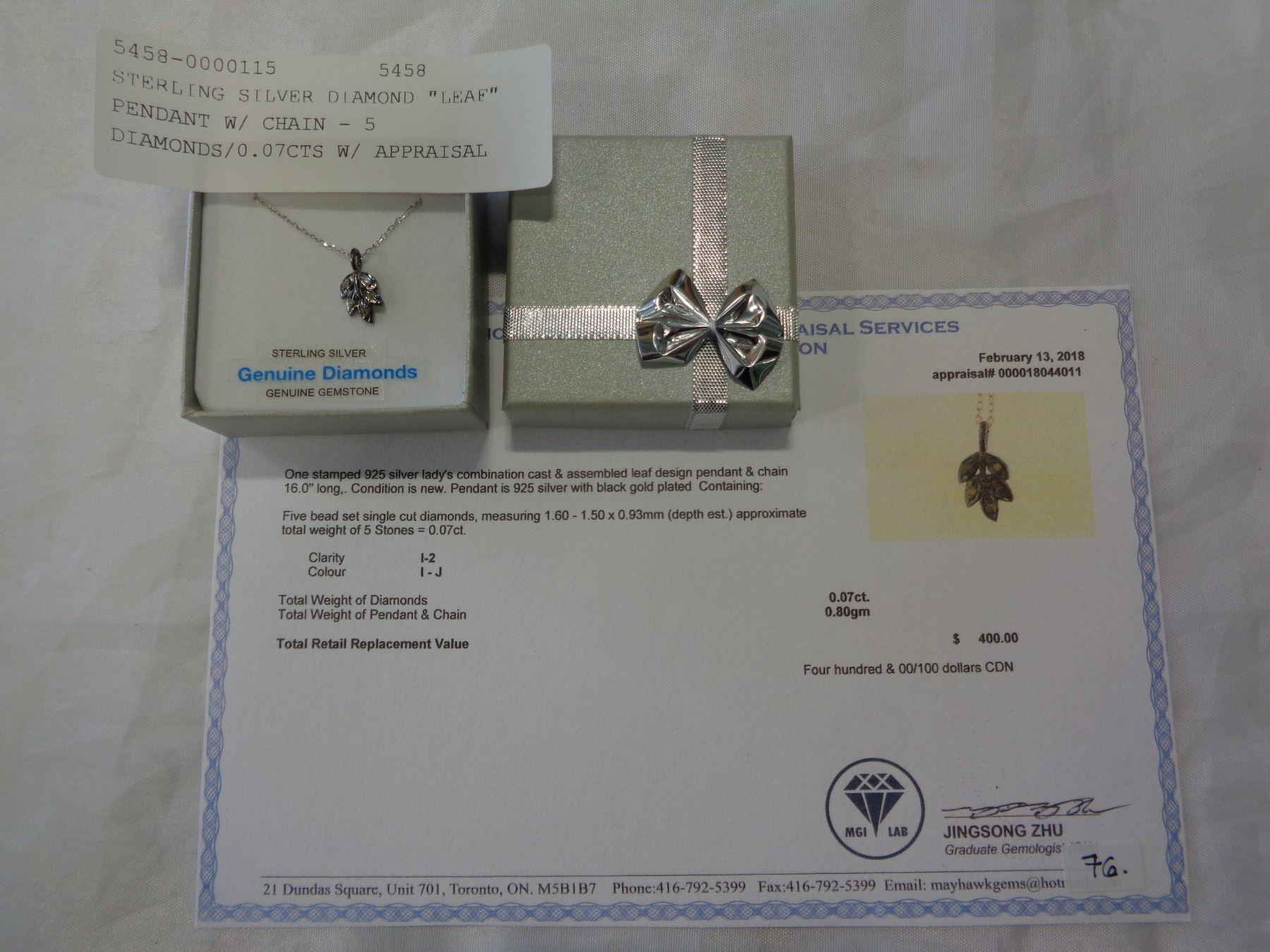 STERLING SILVER DIAMOND "LEAF" PENDANT W/ CHAIN - 5 DIAMONDS/0.07CTS W/ APPRAISAL $400