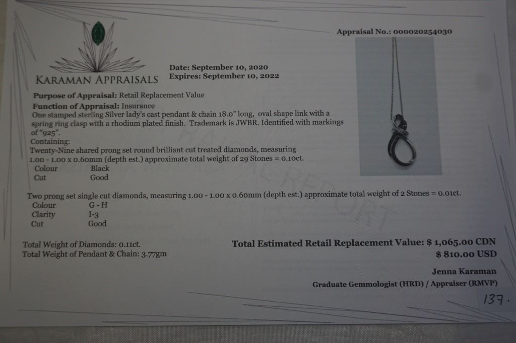 STERLING SILVER DIAMOND PENDANT W/ CHAIN W/ APPRAISAL $1065 - 31 DIAMONDS (0.11CTS)