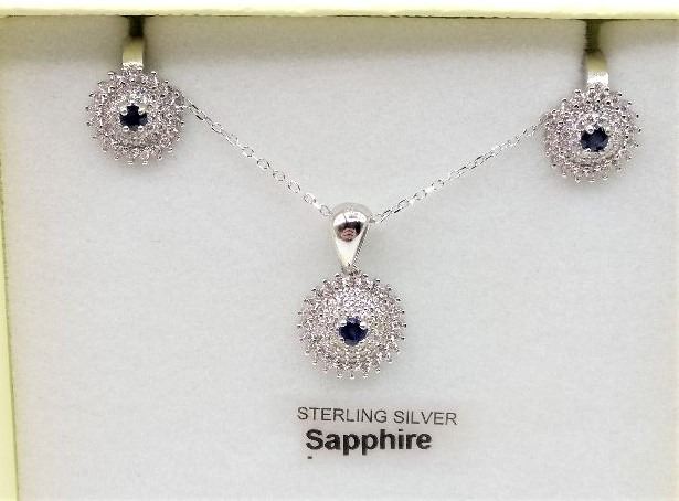 STERLING SILVER EARRINGS AND PEDANT SET W/ GENUINE SAPPHIRE, CZ, AND 16" CHAIN W/ APPRAISAL $965