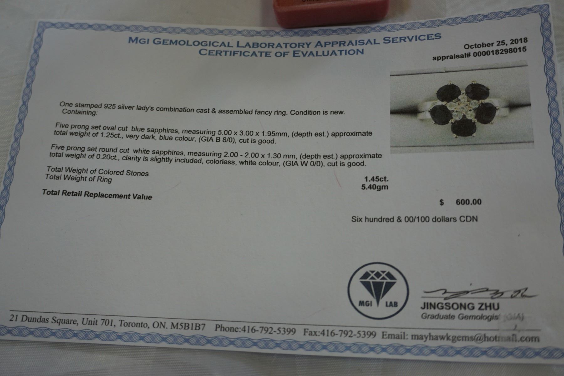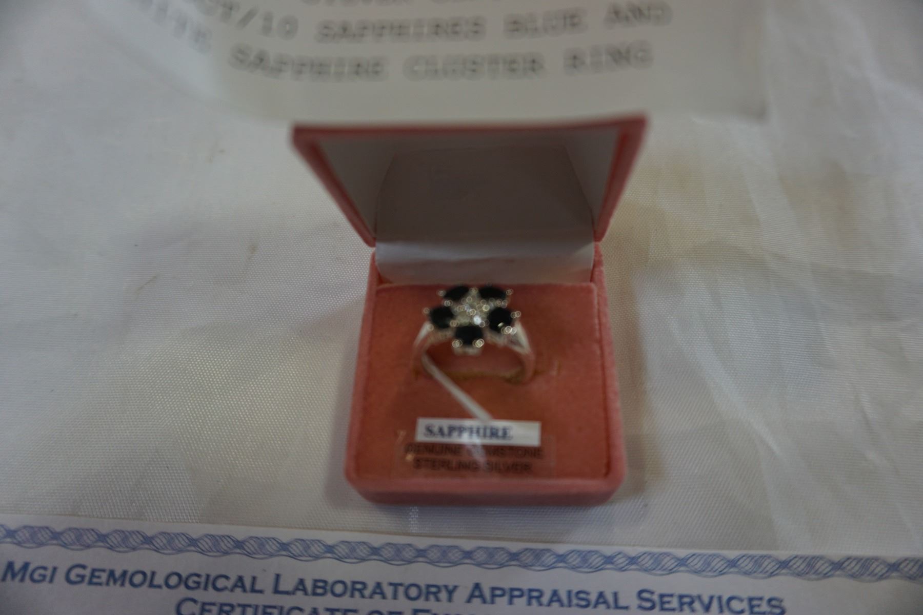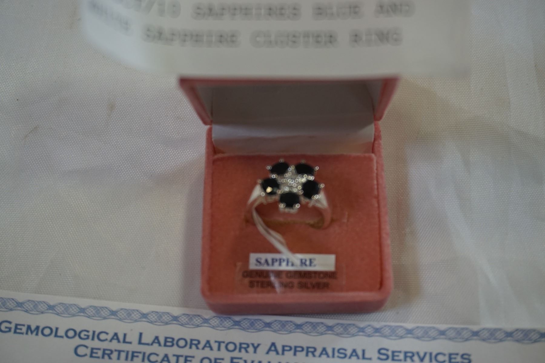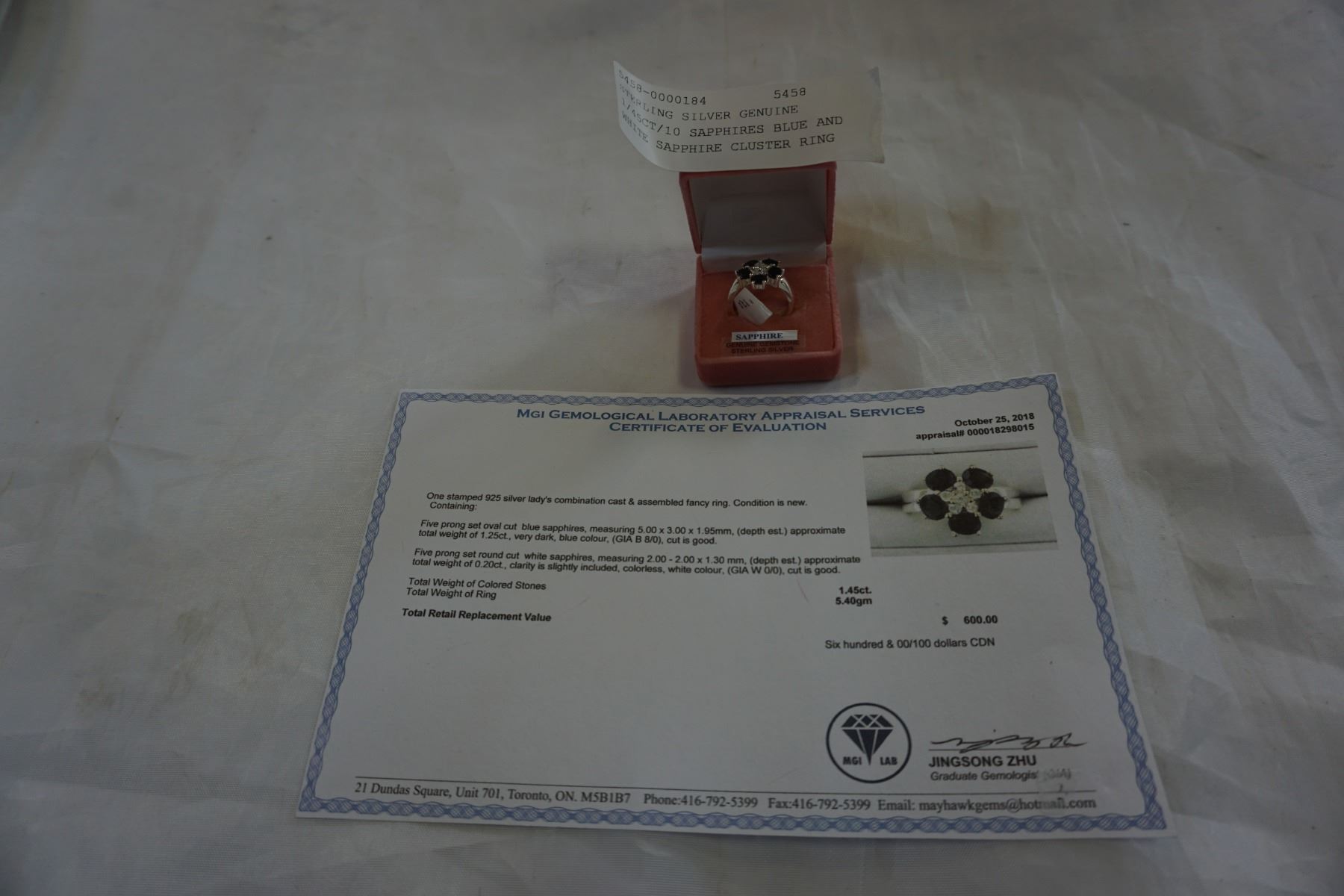 STERLING SILVER GENUINE 1/45CT/10 SAPPHIRES BLUE AND WHITE SAPPHIRE CLUSTER RING SIZE 6.75 W/ APPRAISAL $600