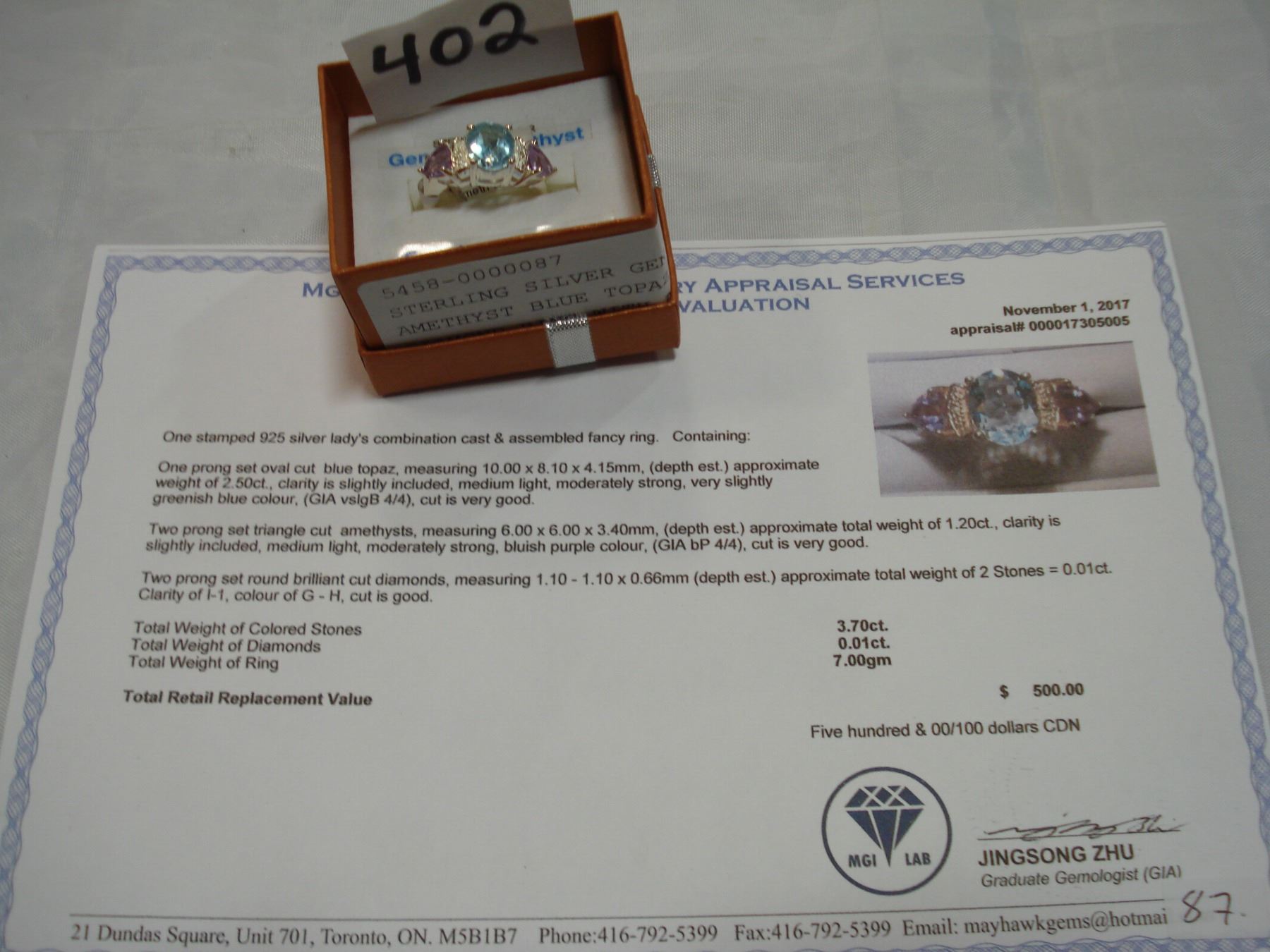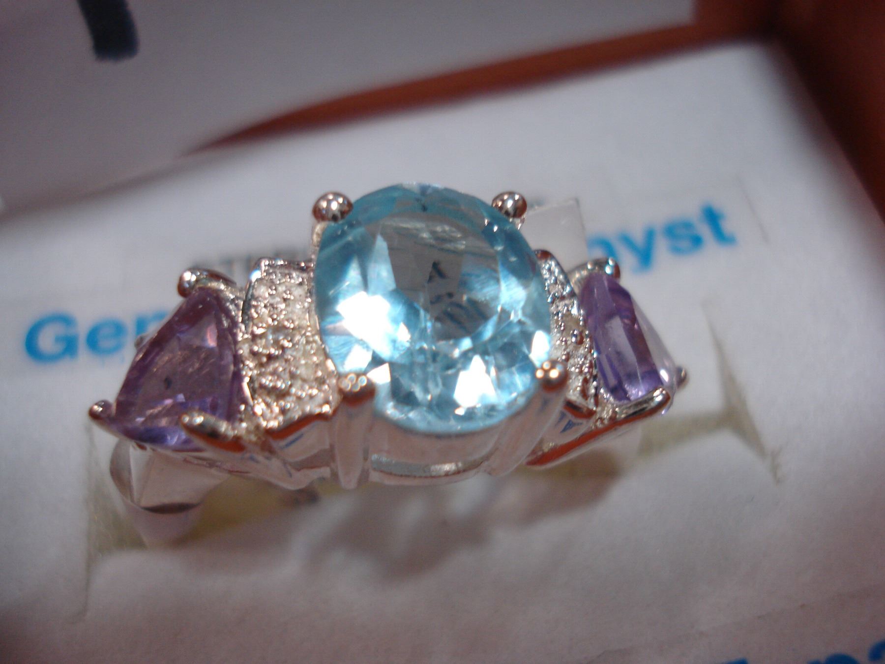 STERLING SILVER GENUINE AMETHYST BLUE TOPAZ AND DIAMOND RING WITH APPRAISEL $500.00
