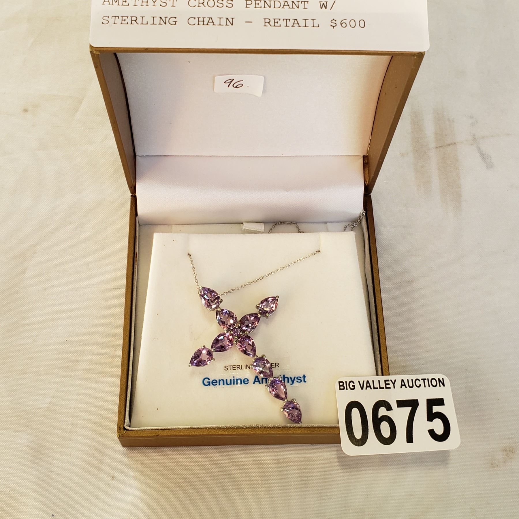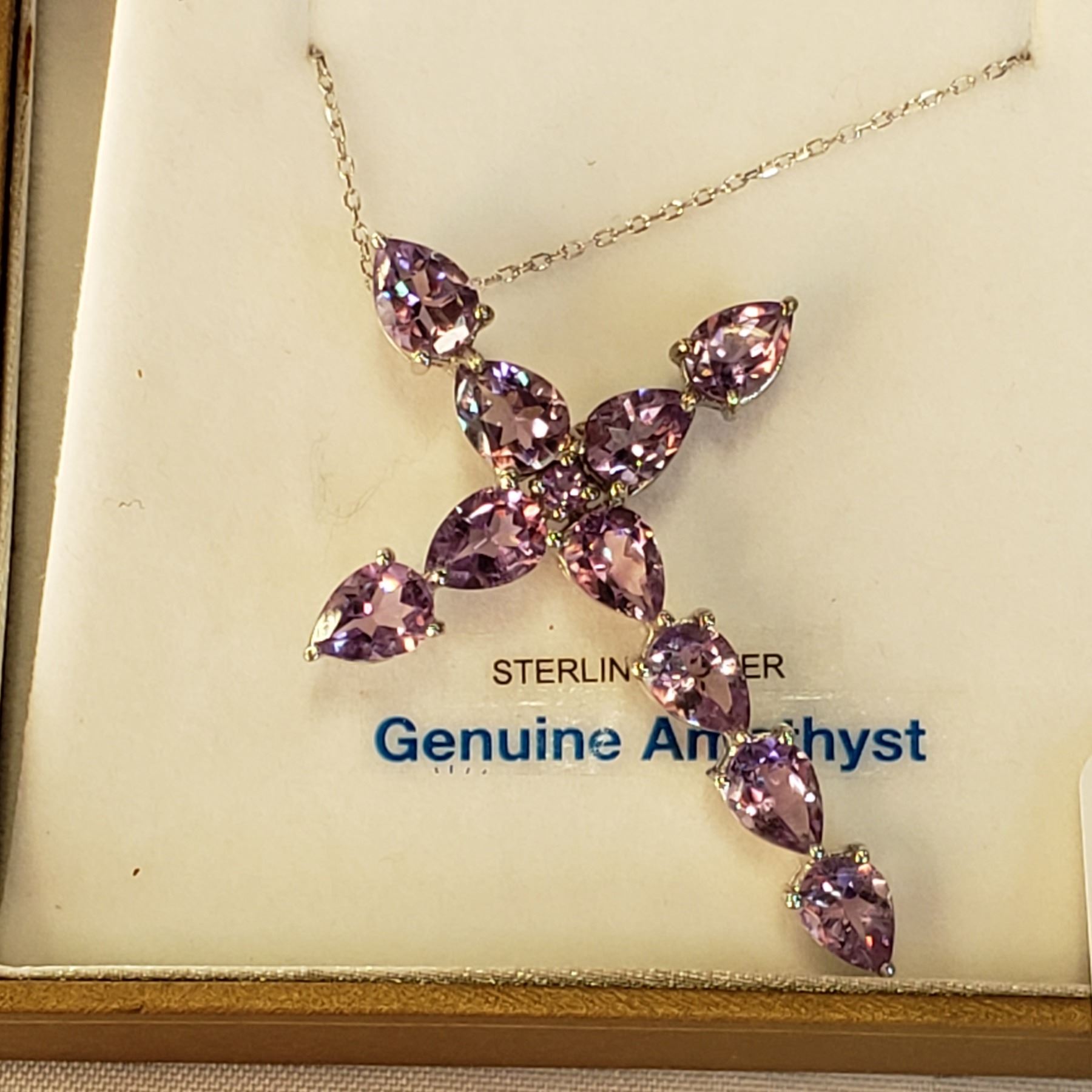 STERLING SILVER GENUINE AMETHYST CROSS PENDANT W/ STERLING CHAIN - RETAIL $600