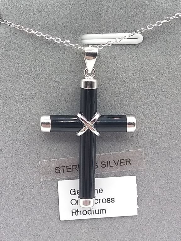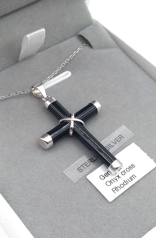 STERLING SILVER GENUINE BLACK ONYX CROSS PENDANT W/ STERLING CHAIN W/ APPRAISAL $545, 6CTS BLACK ONYX
