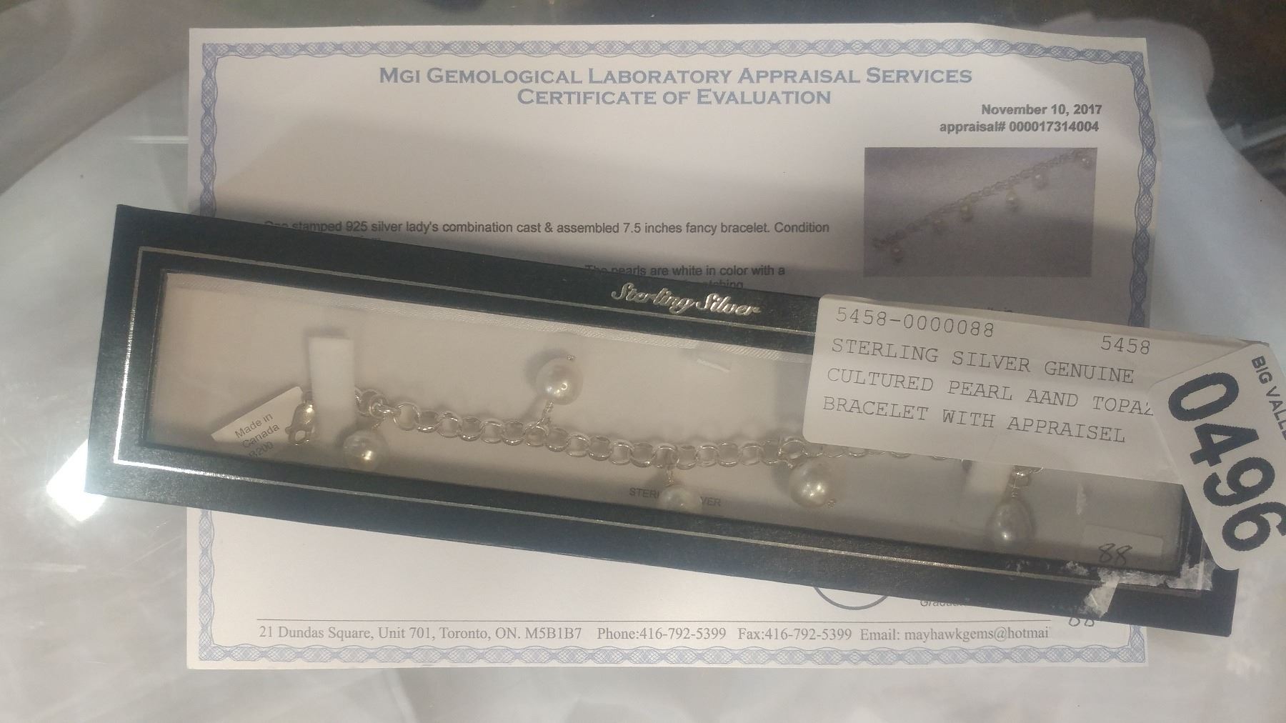 STERLING SILVER GENUINE CULTURED PEARL AAND TOPAZ BRACELET WITH APPRAISEL $1000.00