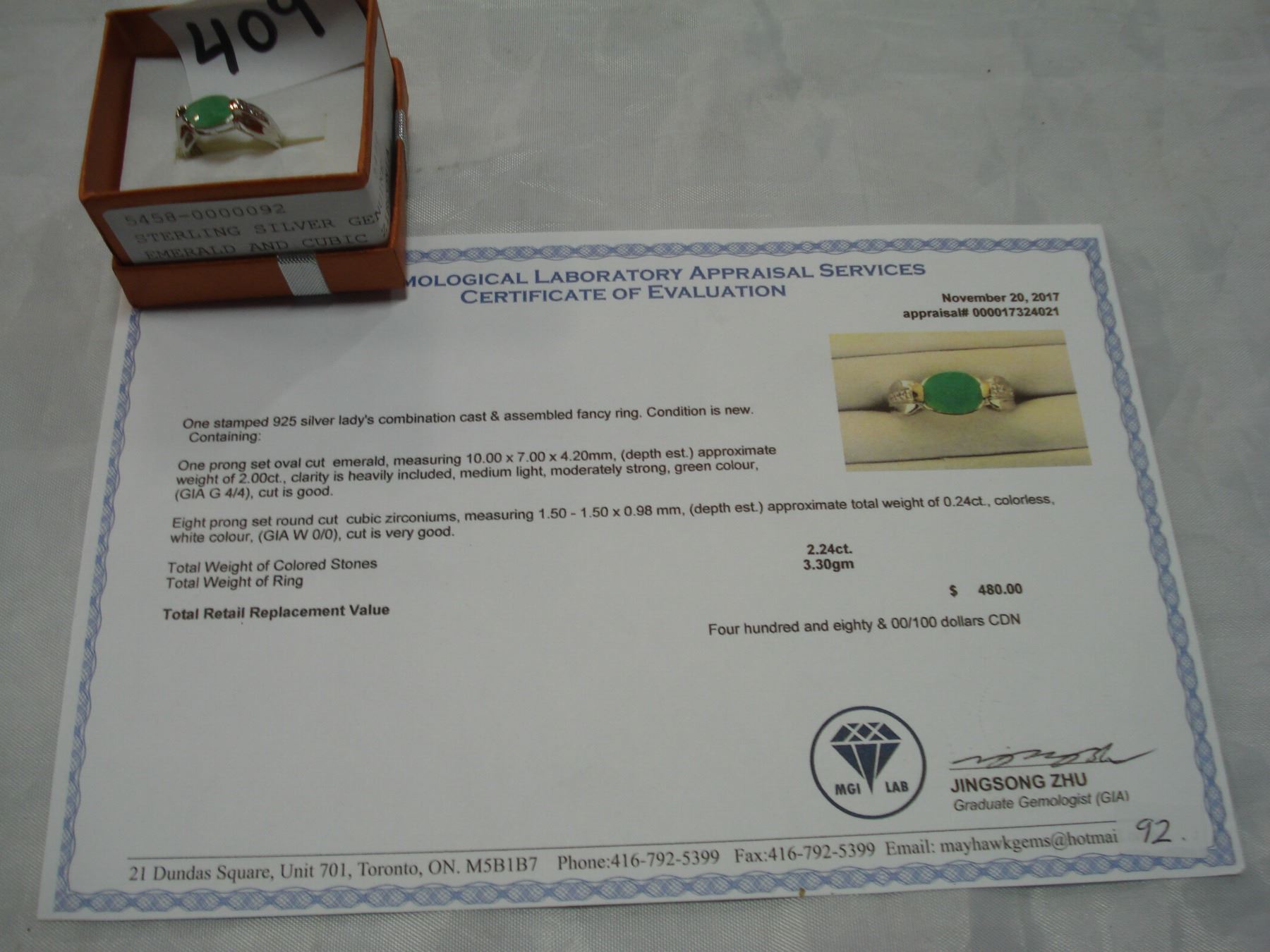 STERLING SILVER GENUINE EMERALD AND CUBIC ZIRCONIA RING WITH APPRAISEL$480.00