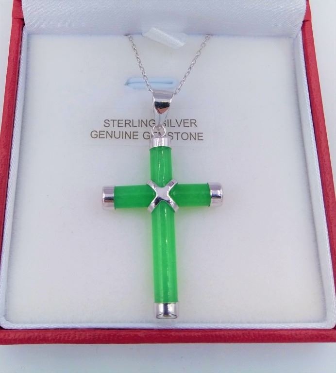 STERLING SILVER GENUINE JADE CROSS PENDANT W/ STERLING CHAIN W/ APPRAISAL $450