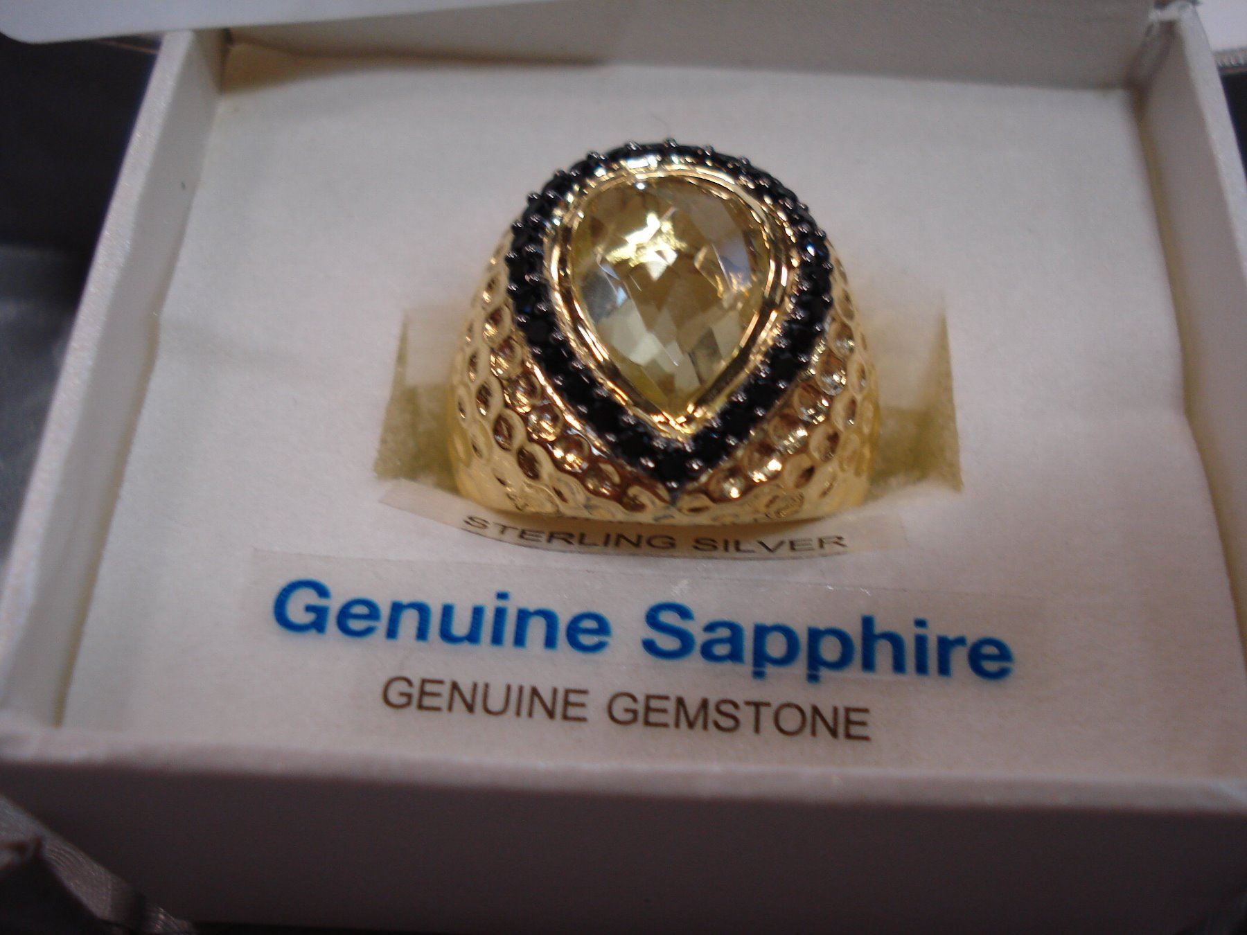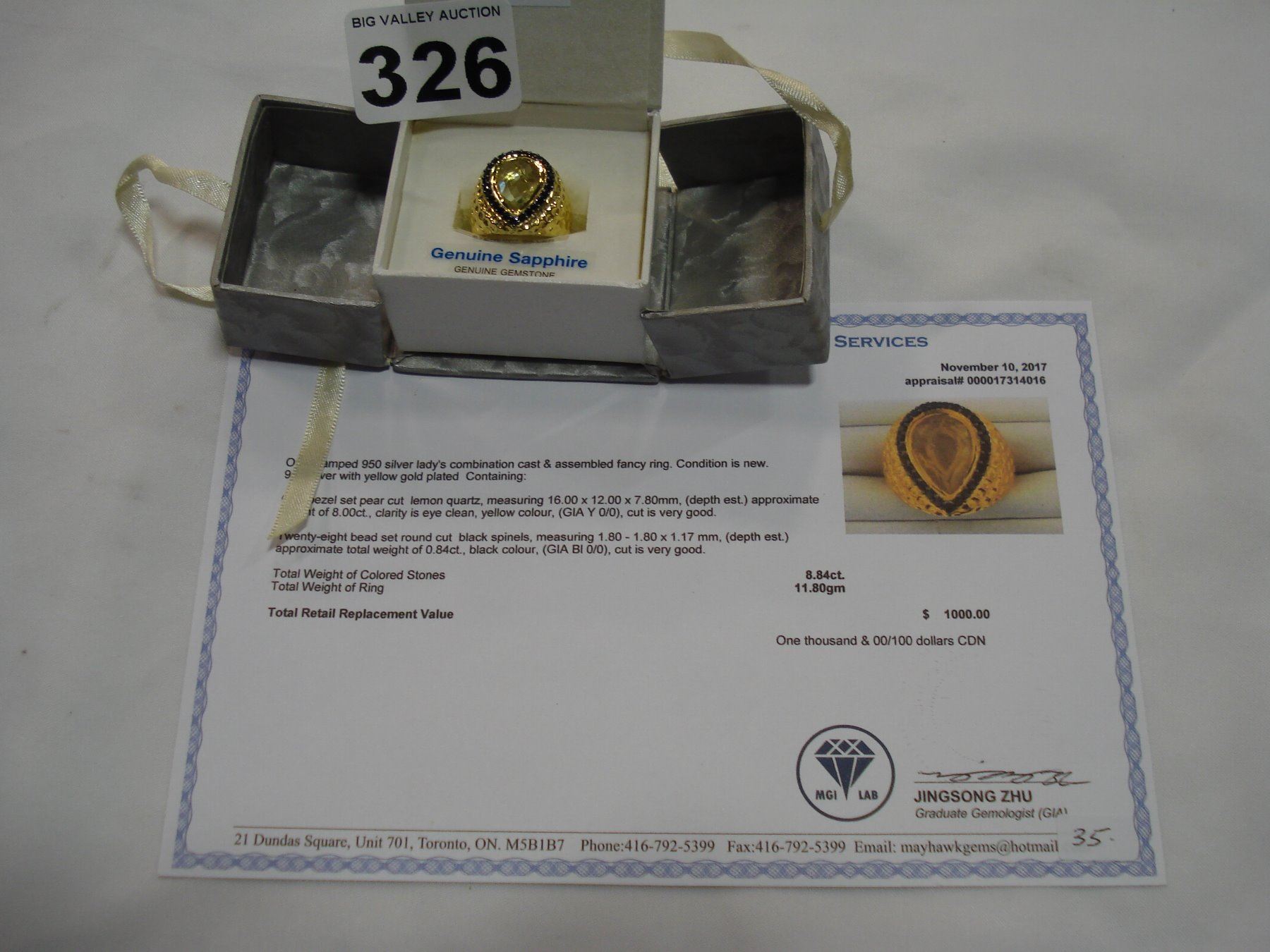 STERLING SILVER GOLD PLATED GENUINE LEMON QUARTZ AND BLACK SPINEL COCKTAIL RING WITH APPRAISEL $1000.00