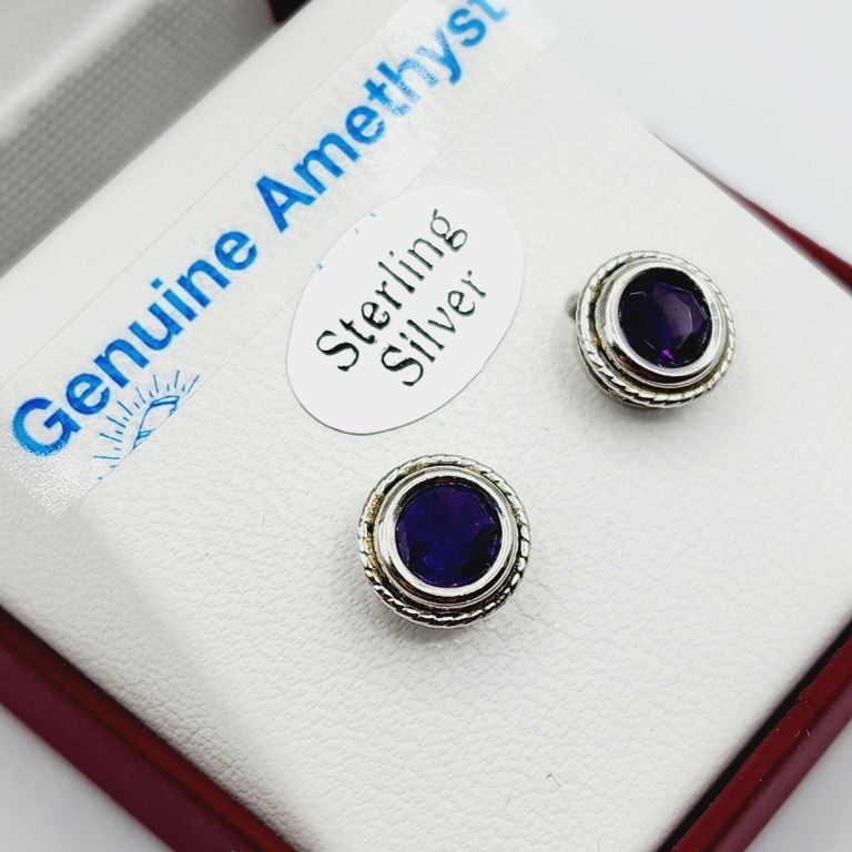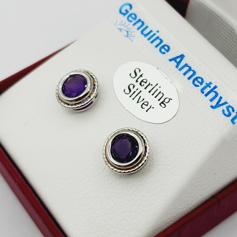 STERLING SILVER NATURAL AMETHYST (1.60CT) EARRINGS, W/A $420.00. AMETHYST IS THE BIRTHSTONE FOR FEBRUARY.