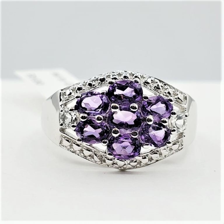 STERLING SILVER NATURAL AMETHYST (1CT) & WHITE SAPPHIRE RING, W/A $400.00, SIZE 7