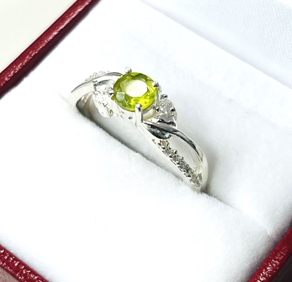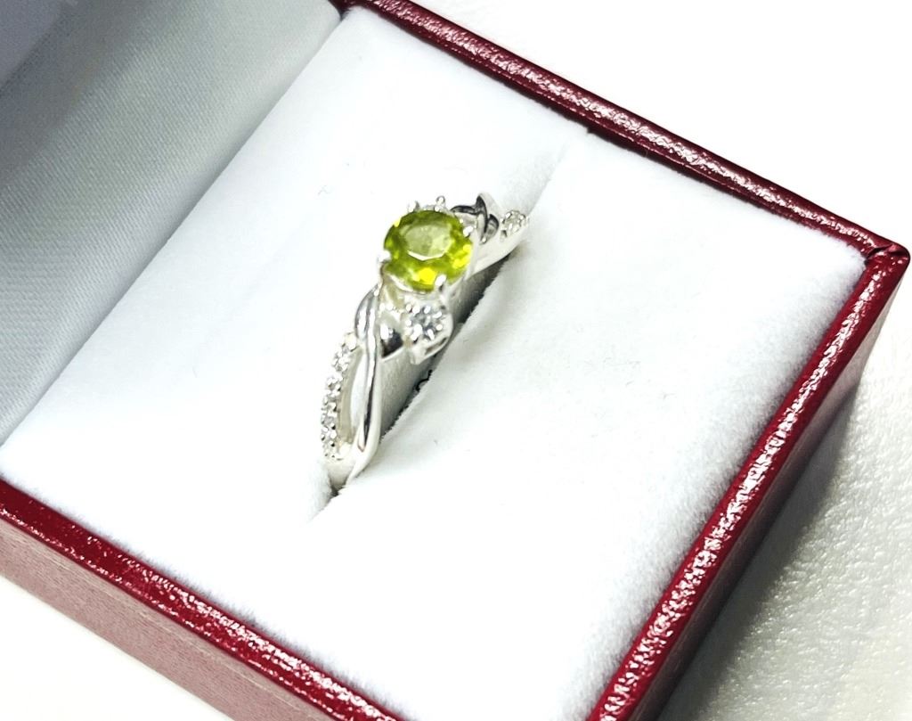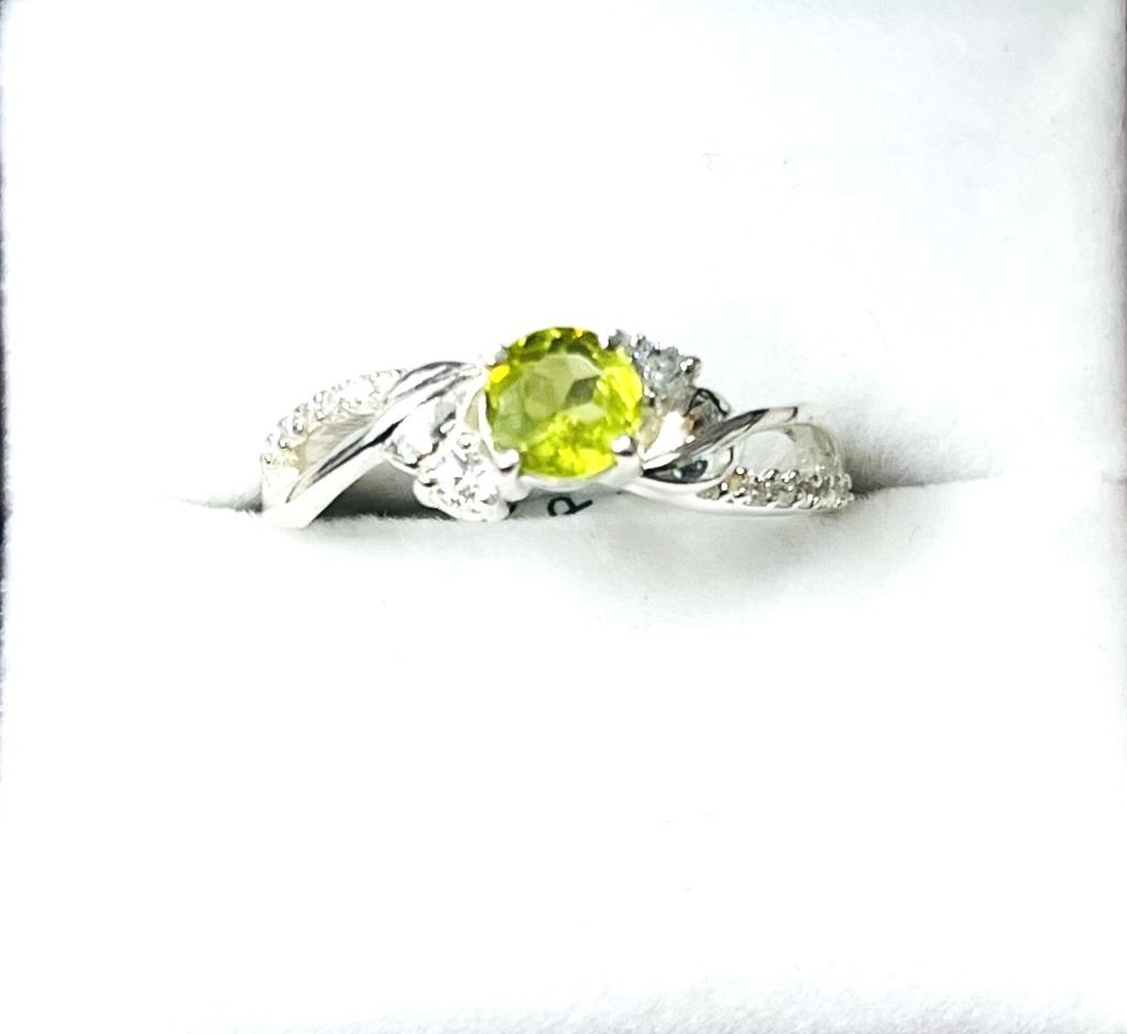 STERLING SILVER NATURAL PERIDOT (0.60CT) AND NATURAL WHITE TOPAZ (0.04CT) RING, SIZE 7.25, W/A $550.00. PERIDOT IS THE BIRTHSTONE FOR AUGUST.