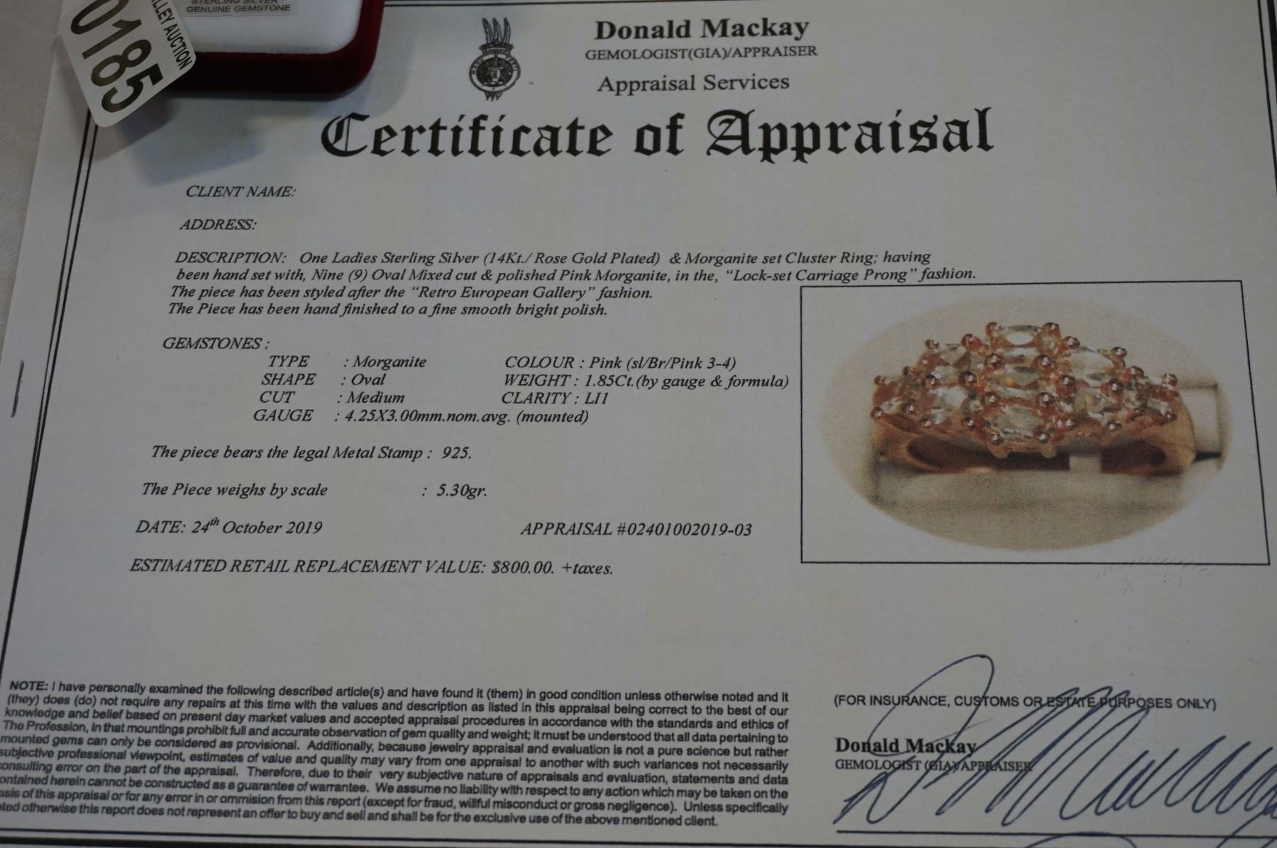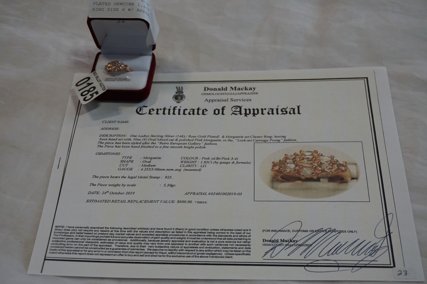 STERLING SILVER RODE GOLD PLATED GENUINE 1.8CT MORGANITE RING SIZE 6 W/ APPRAISAL $800