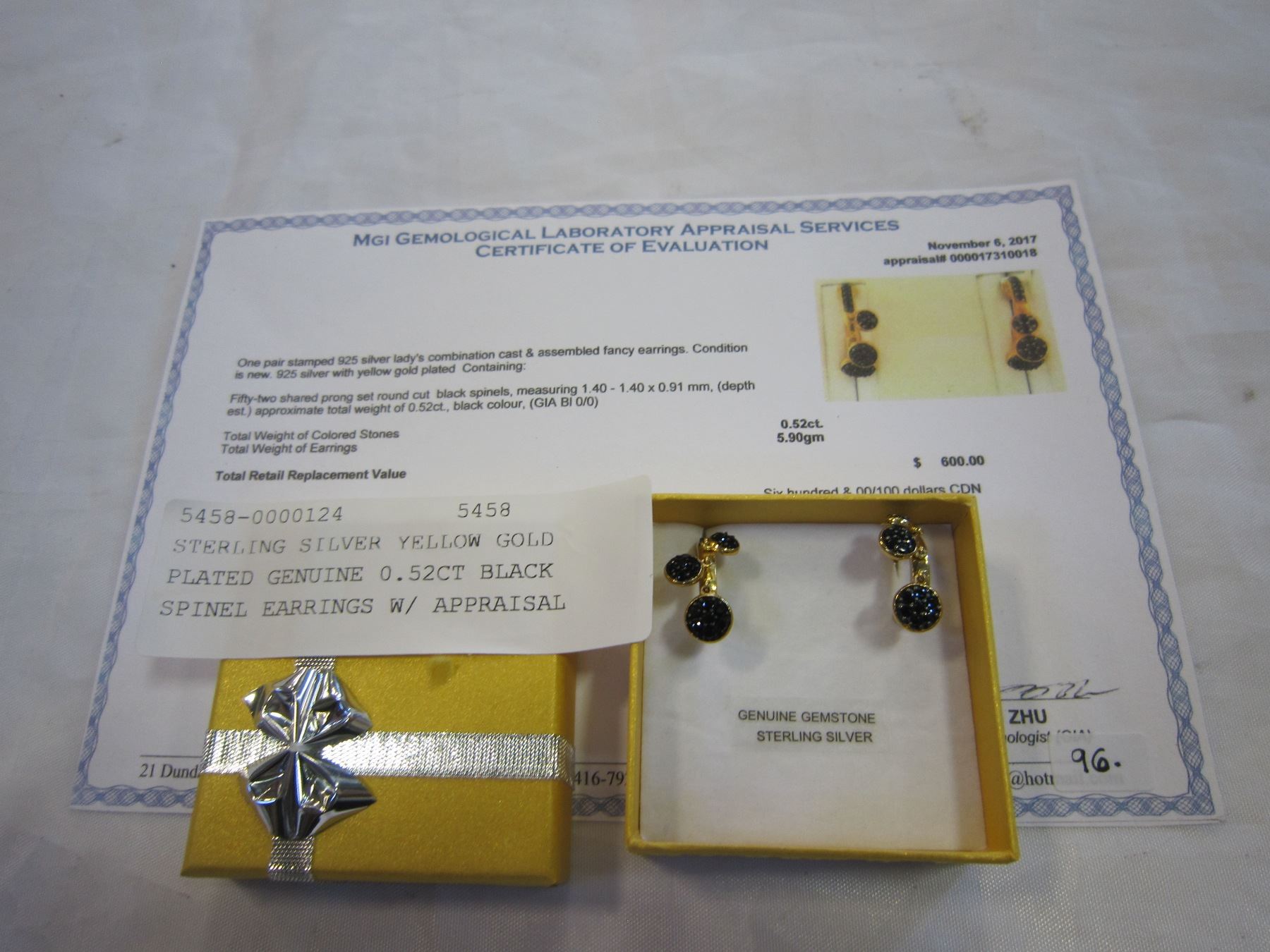 STERLING SILVER YELLOW GOLD PLATED GENUINE 0.52CT BLACK SPINEL EARRINGS W/ APPRAISAL $600