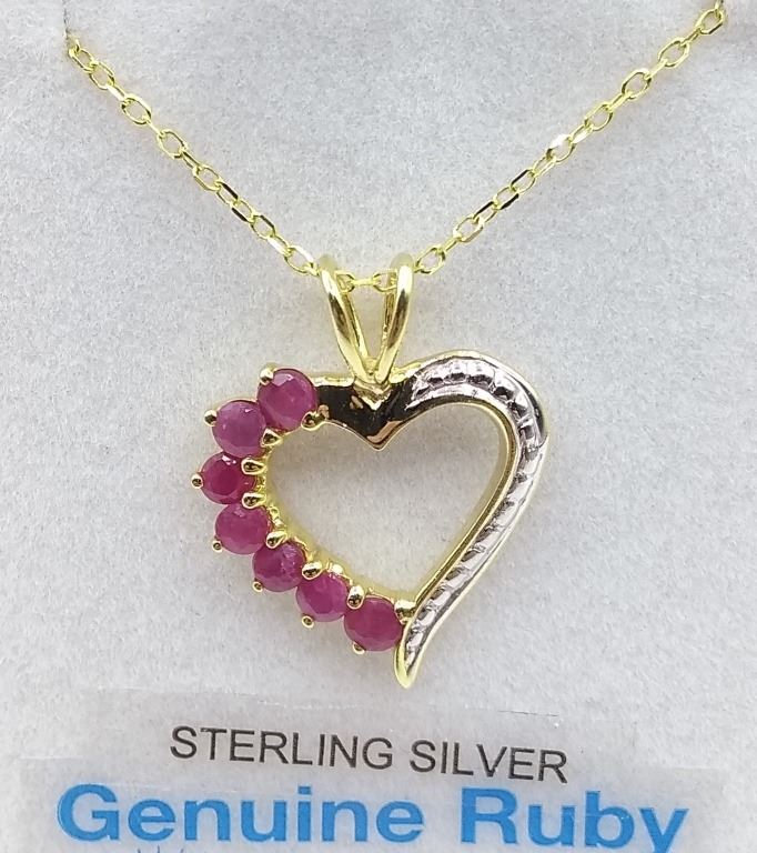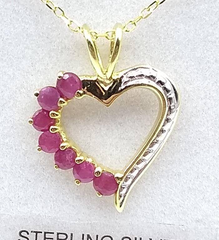 STERLING SILVER YELLOW GOLD PLATED GENUINE RUBY HEART PENDANT W/ STERLING GOLD PLATED CHAIN W/ APPRAISAL $500 - 7 RUBIES (0.3CTS), BIRTHSTONE JULY