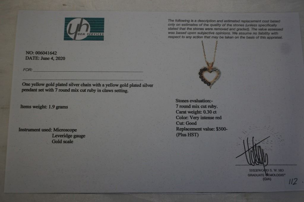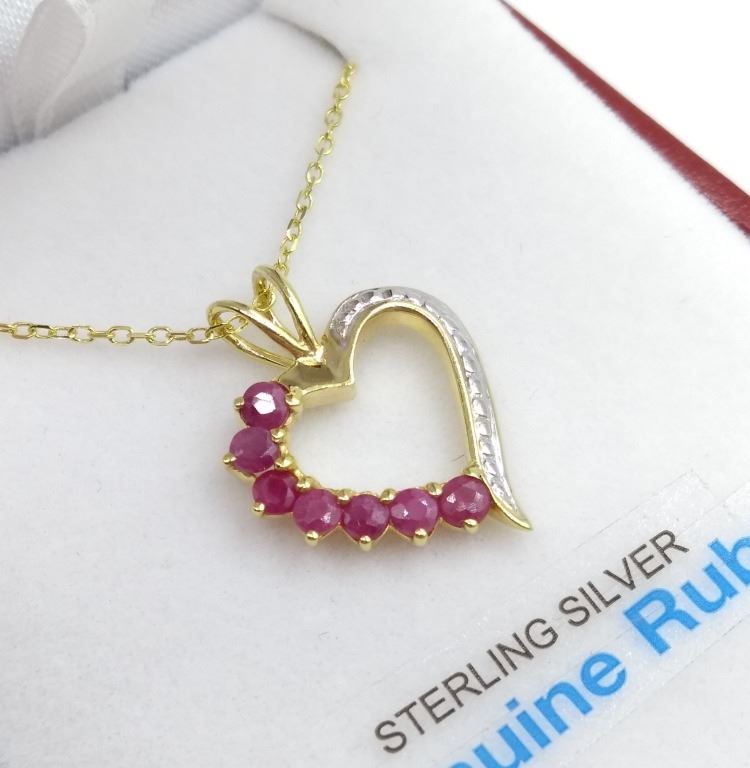 STERLING SILVER YELLOW GOLD PLATED GENUINE RUBY HEART PENDANT W/ STERLING GOLD PLATED CHAIN W/ APPRAISAL $500 - 7 RUBIES (0.3CTS), BIRTHSTONE JULY