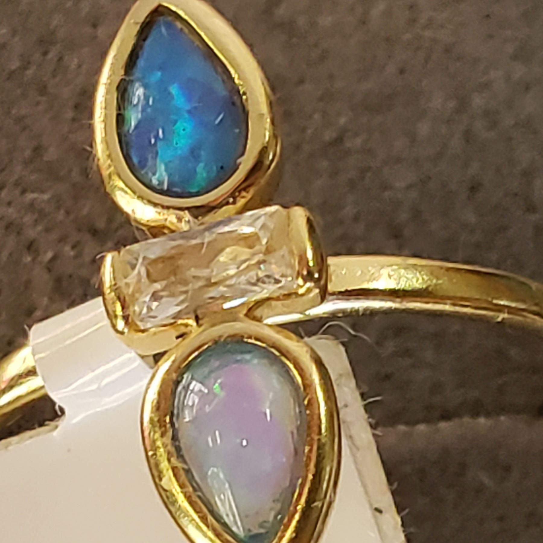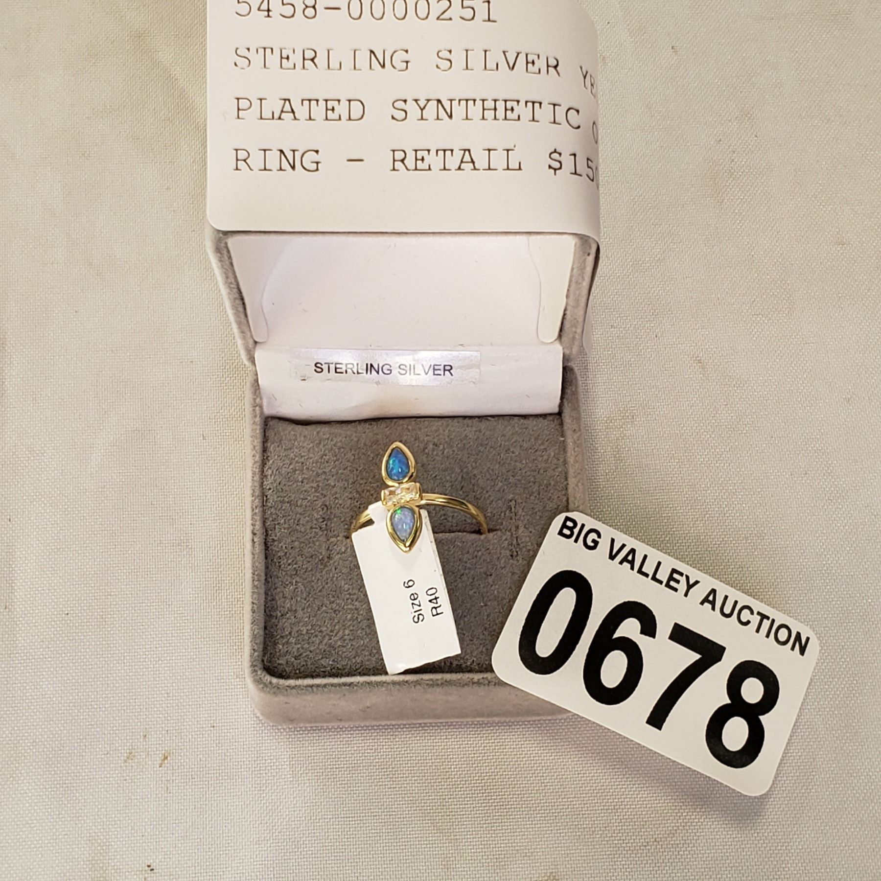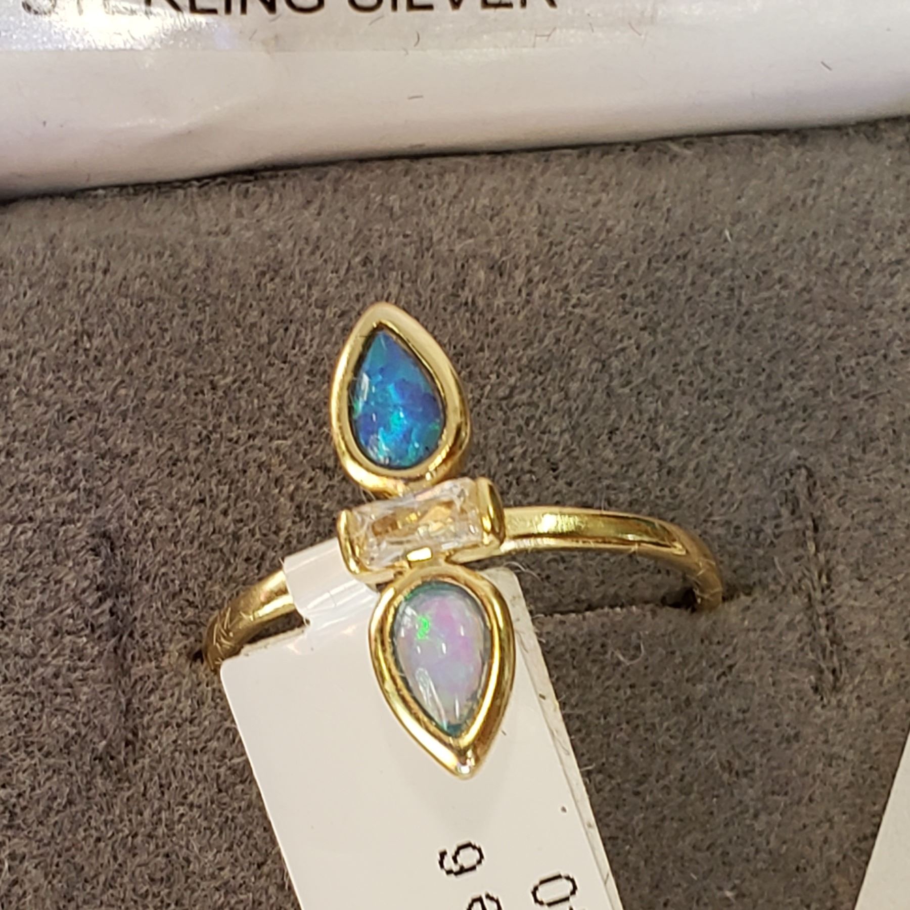 STERLING SILVER YELLOW GOLD PLATED SYNTHETIC OPAL AND CZ RING - RETAIL $150