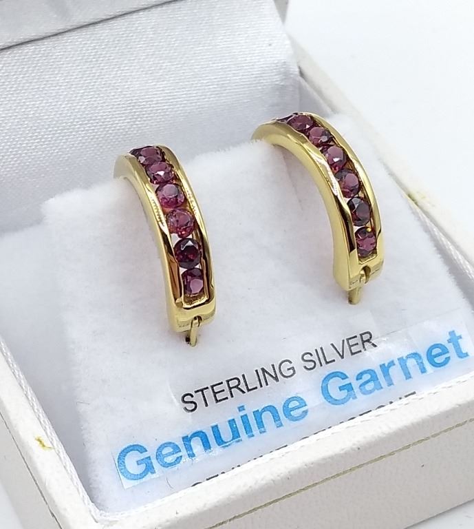 STERLING SIVER YELLOW GOLD PLATED GENUINE GARNET HOOP EARRINGS W/ APPRAISAL $860 - 14 GARNET (.7CTS) BIRTHSTONE JANUARY
