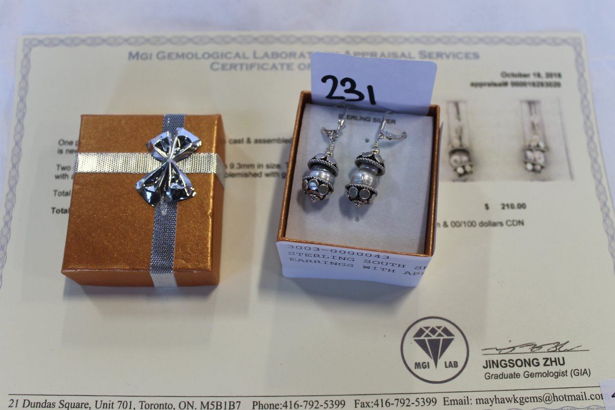 STERLING SOUTH SEA PEARL EARRINGS WITH APPRAISAL $210