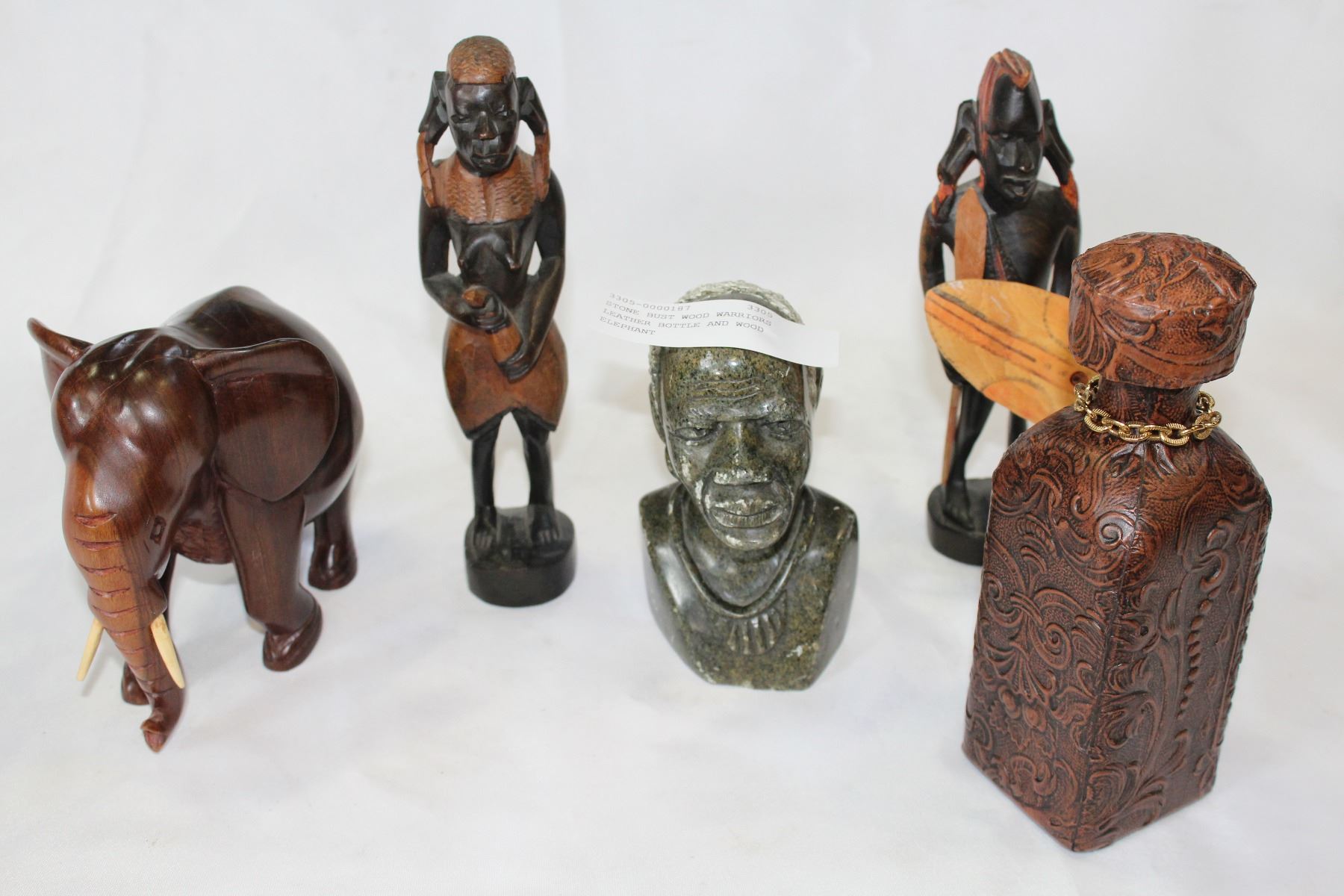 STONE BUST WOOD WARRIORS LEATHER BOTTLE AND WOOD ELEPHANT