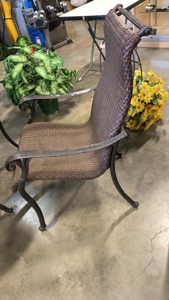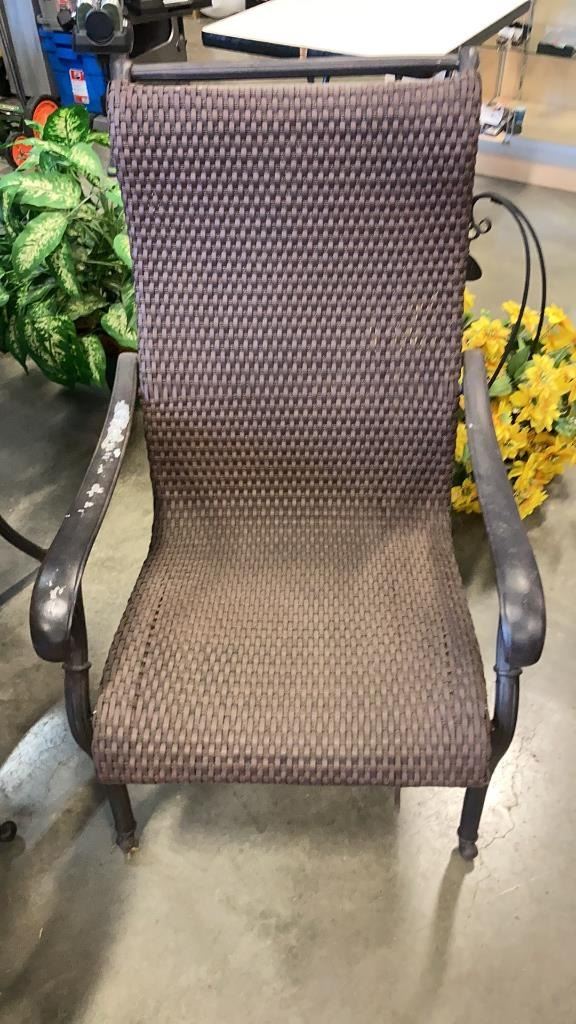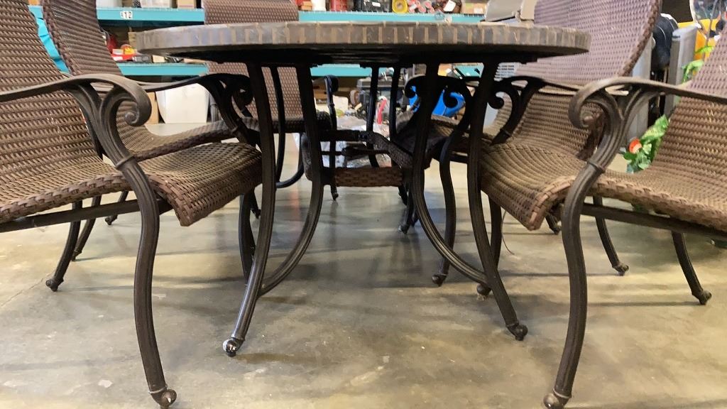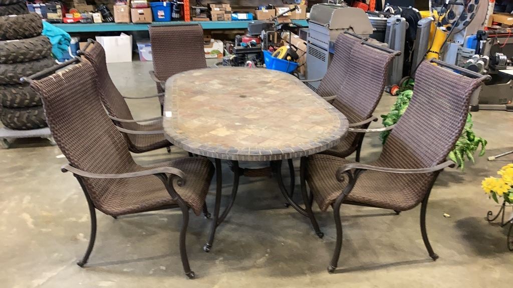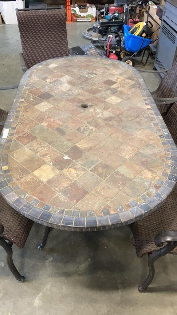 STONE TOP PATIO TABLE WITH 6 WICKER CHAIRS