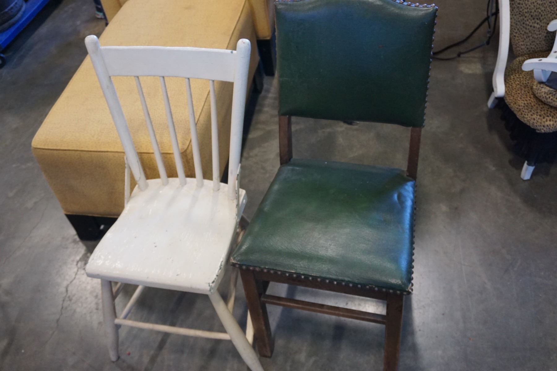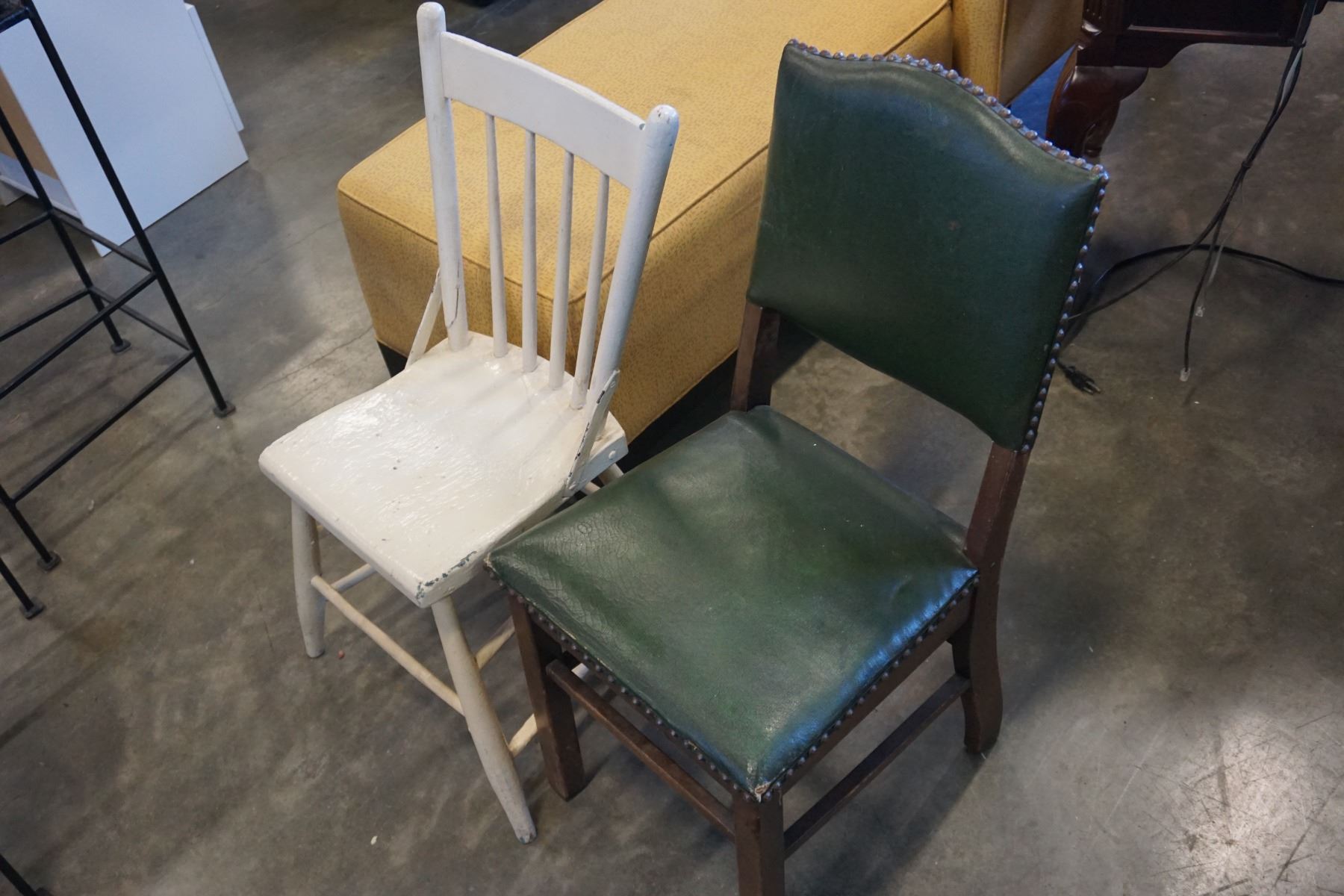 STUDDED GREEN CHAIR AND PAINTED WHITE CHAIR