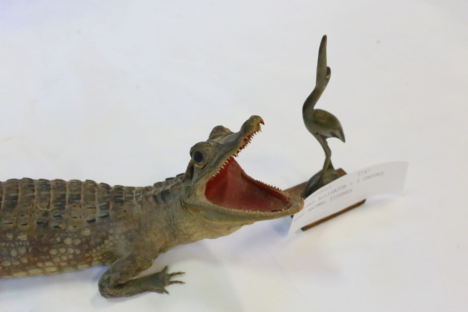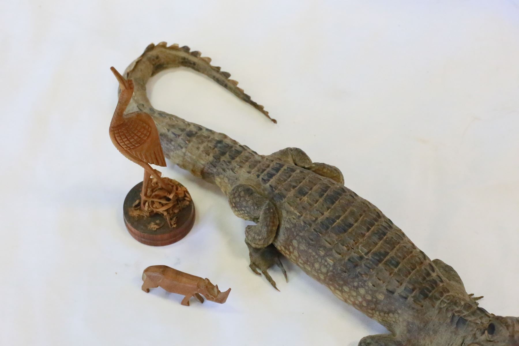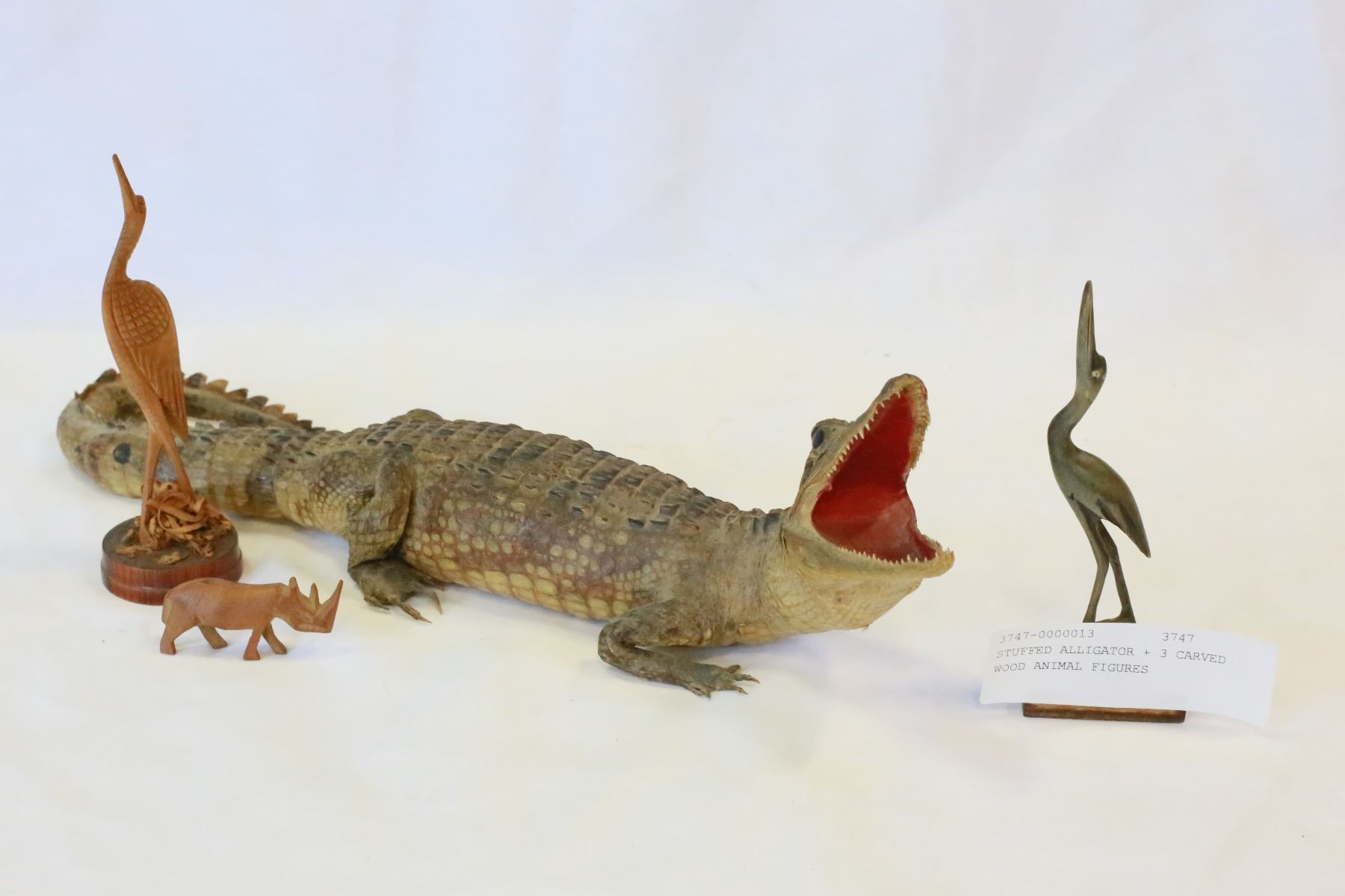STUFFED ALLIGATOR + 3 CARVED WOOD ANIMAL FIGURES