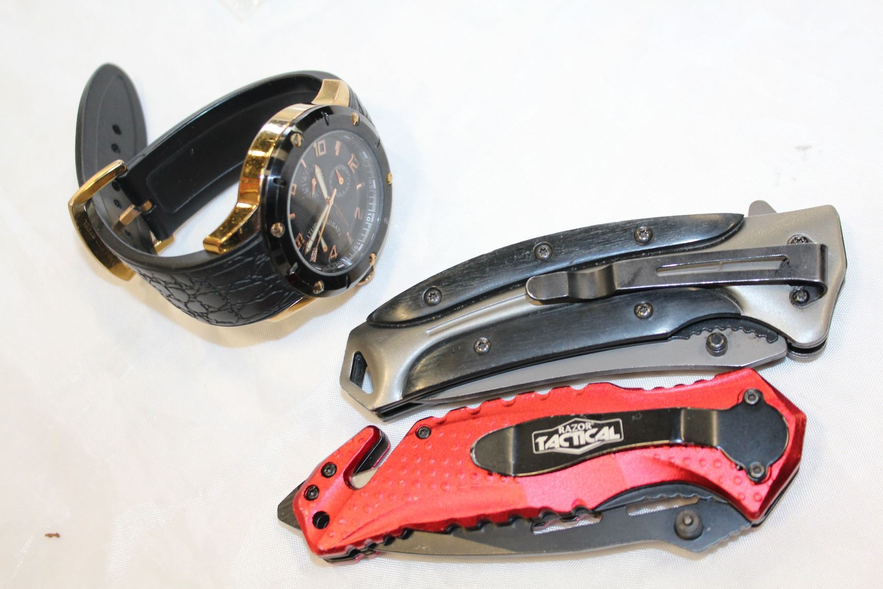 STUHRLING WATCH AND TWO POCKET KNIVES