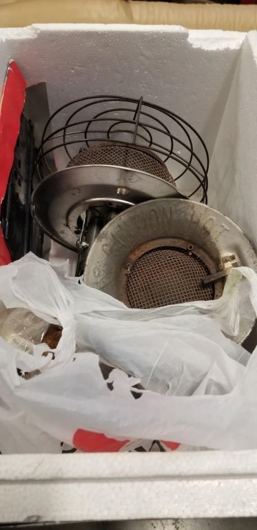 STYROFOAM COOLER WITH PROPANE HEATERS AND ASSORTED CMAPING DISHES ETC