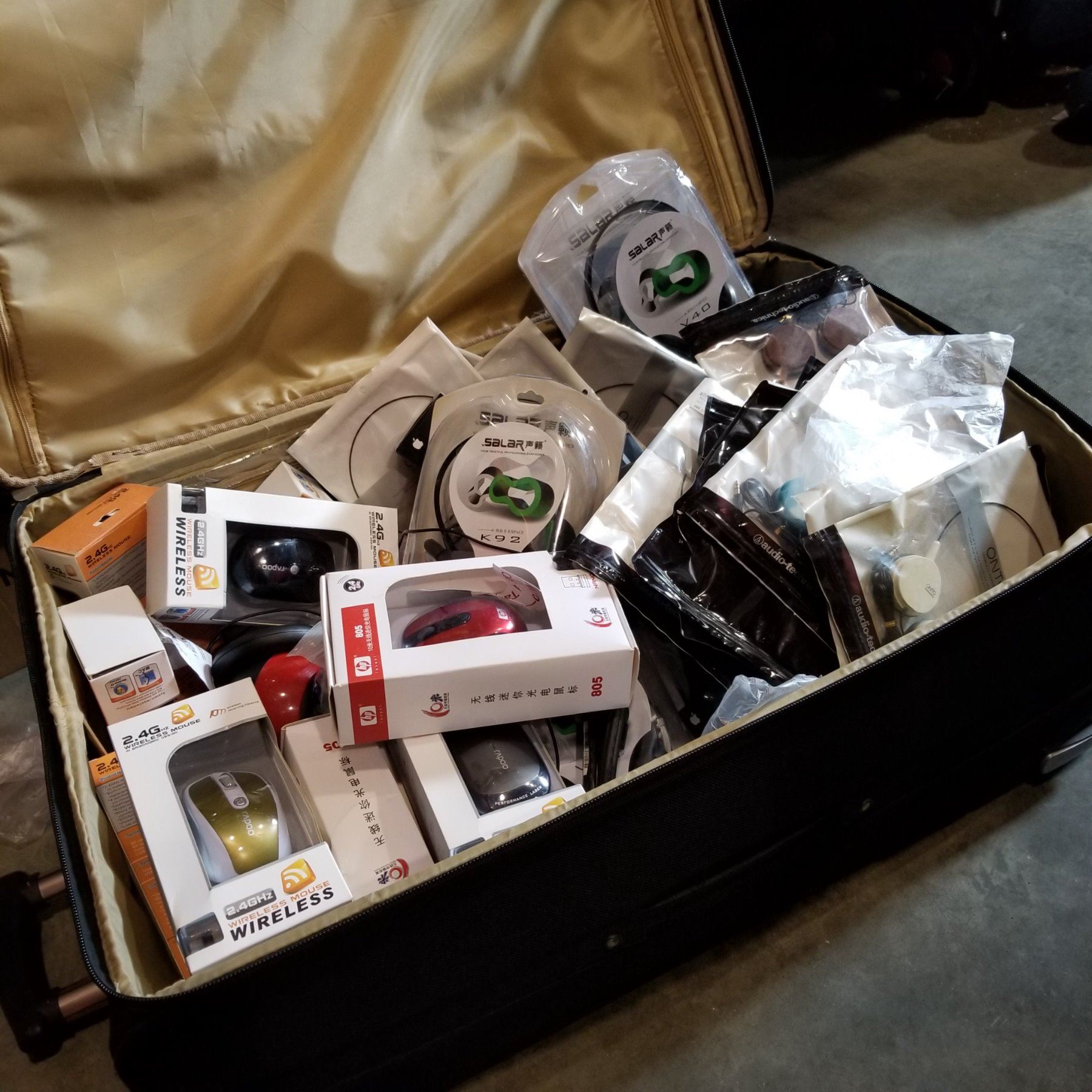 SUITECASE FULL OF NEW WIRELESS MICE, EARBUDS, AND MORE