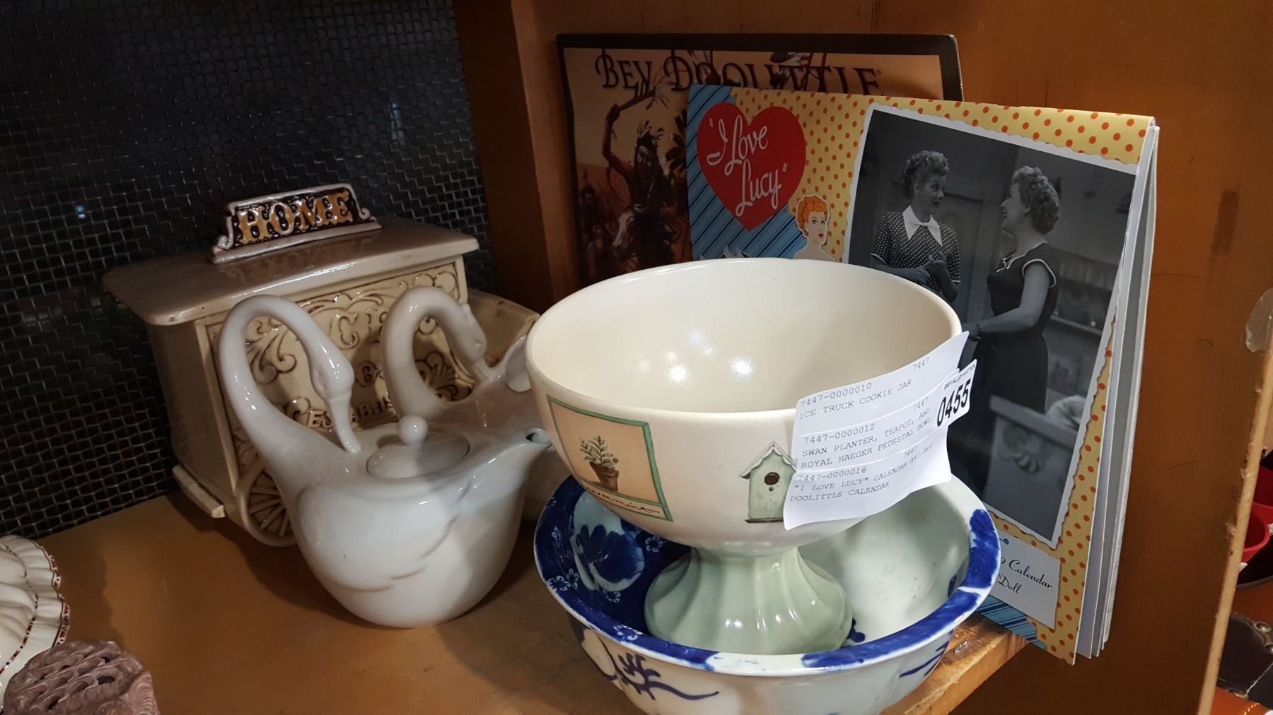 SWAN PLANTER, TEAPOT, AND ROYAL HAEGER PEDESTAL BOWL ICE TRUCK COOKIE JAR AND BEV DOOLITTLE AND I LOVE LUCY POSTERS