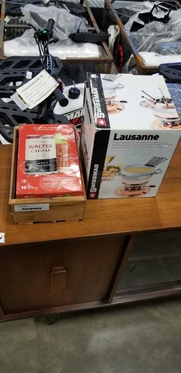 SWISSMAR FONDUE POT SET AND CASE OF WALTERS NON-ALCOHOLIC CEASAR MIX