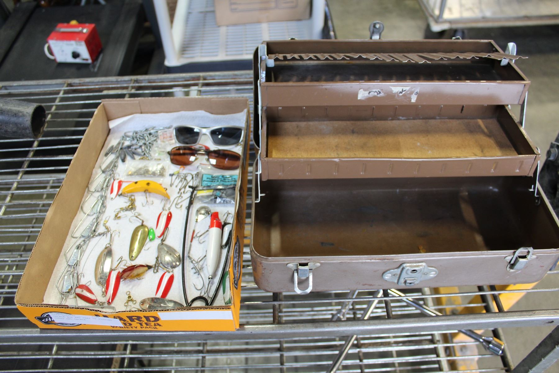 TACKLE BOX AND TRAY OF FISHING LURES AND TACKLE