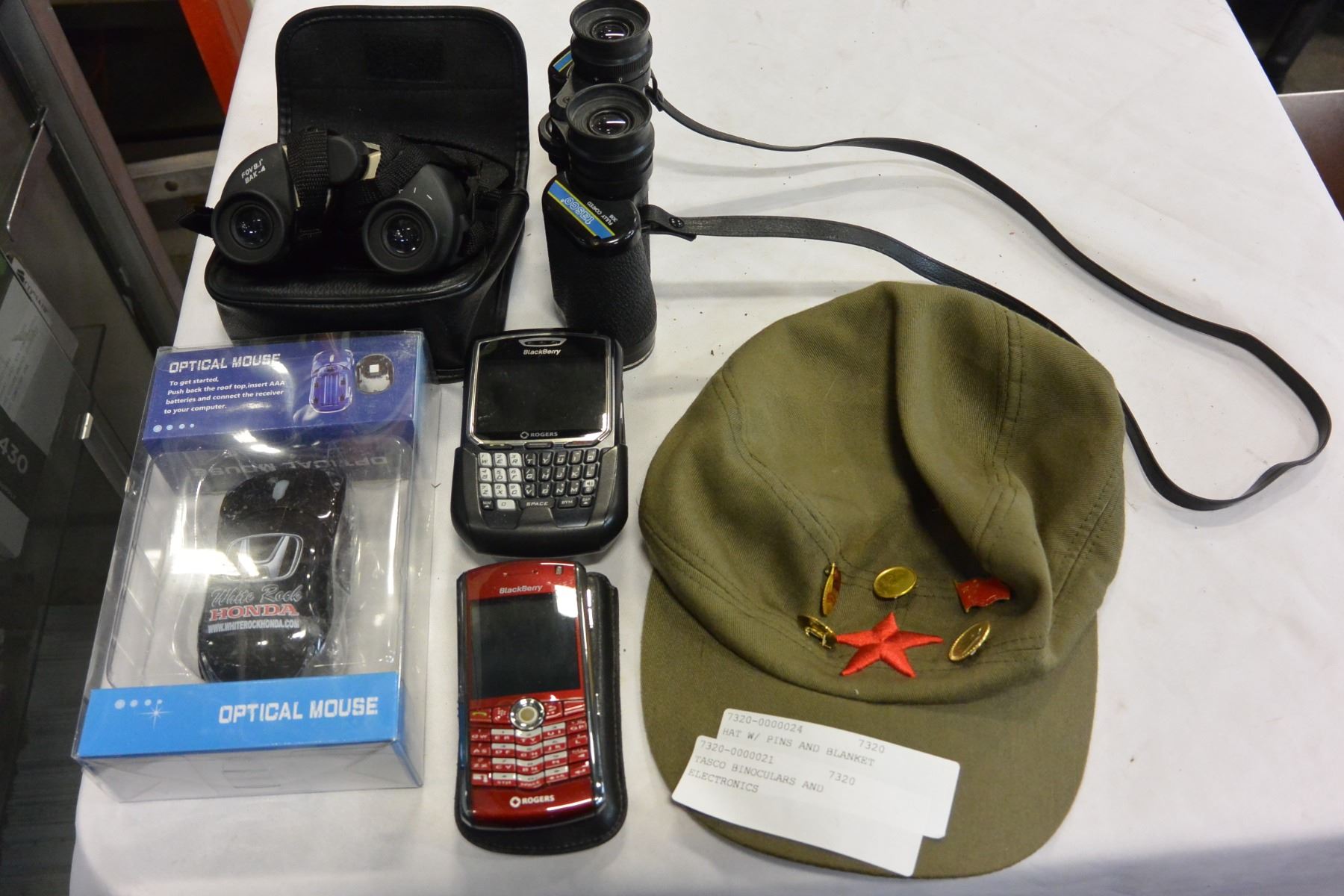 TASCO BINOCULARS AND ELECTRONICS AND HAT W/ PINS AND BLANKET