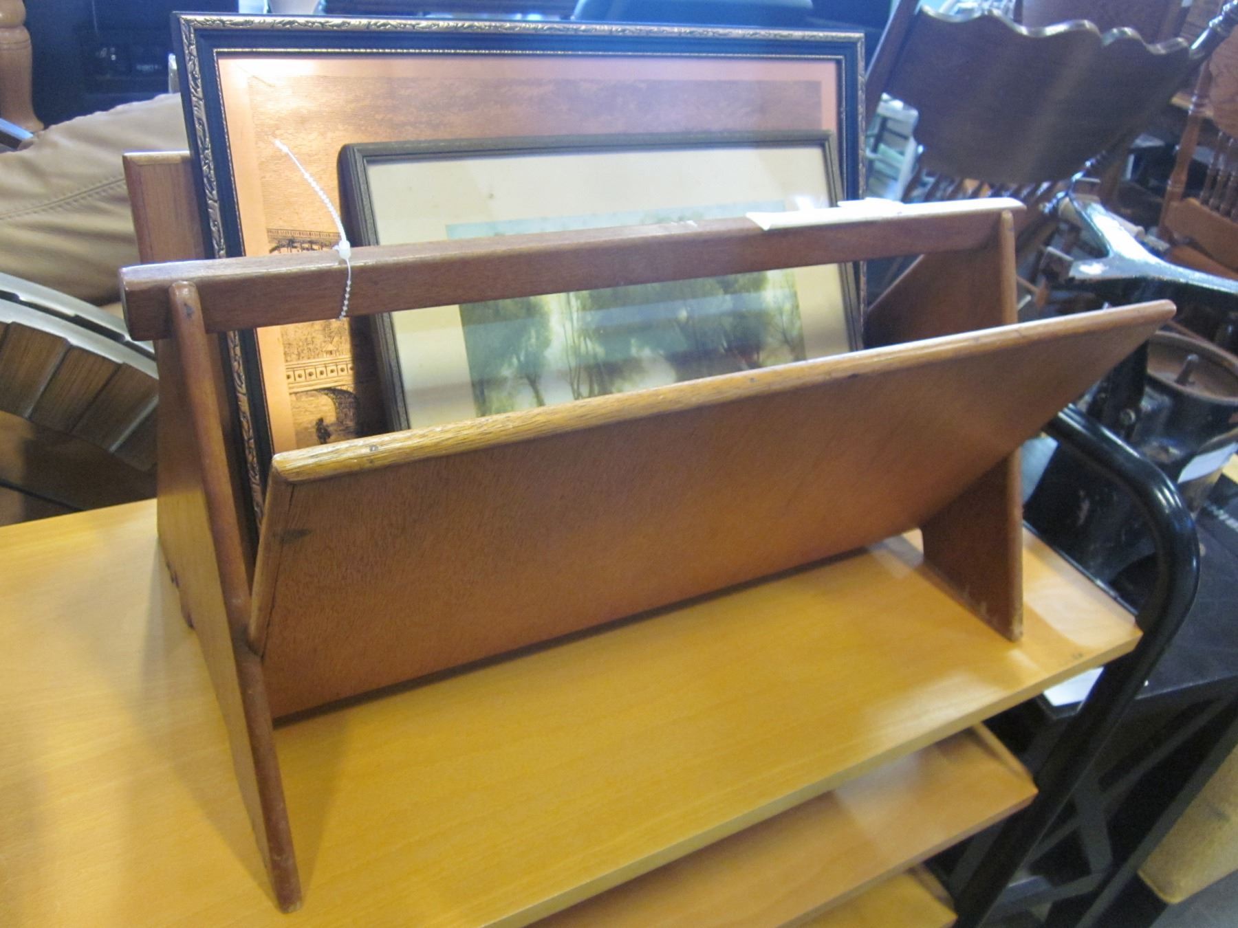 TEAK MAGAZINE RACK AND PRINTS