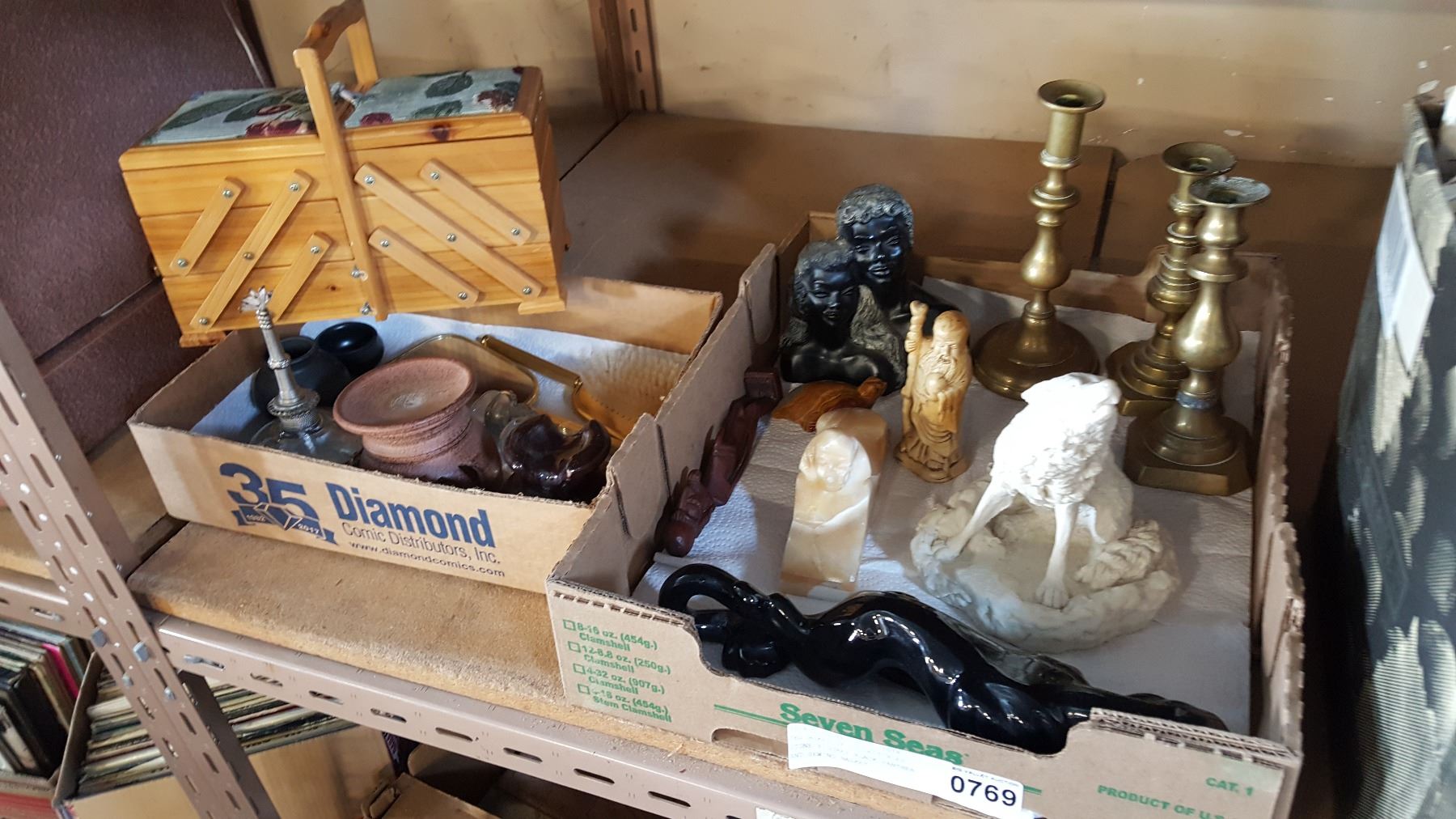 TEO BOXES OF COLLECTIBLES STONE FIGURES BLACK PANTHER AND SEWING BASKET