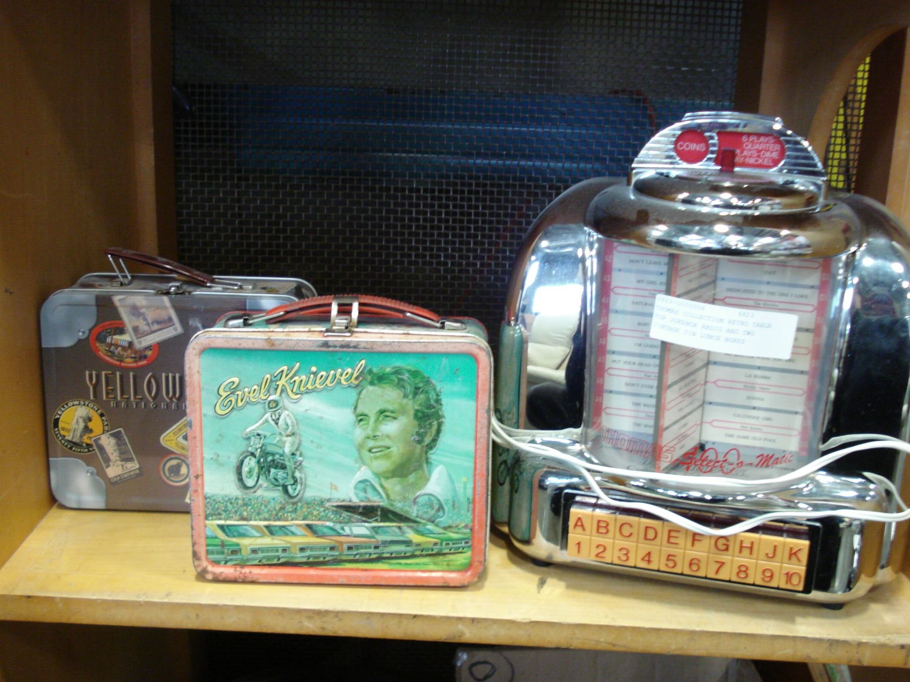 THOMAS COLLECTION RETRO TABLE TOP JUKEBOX RADIO AND TWO VINTAGE TIN LUNCH BOXES
