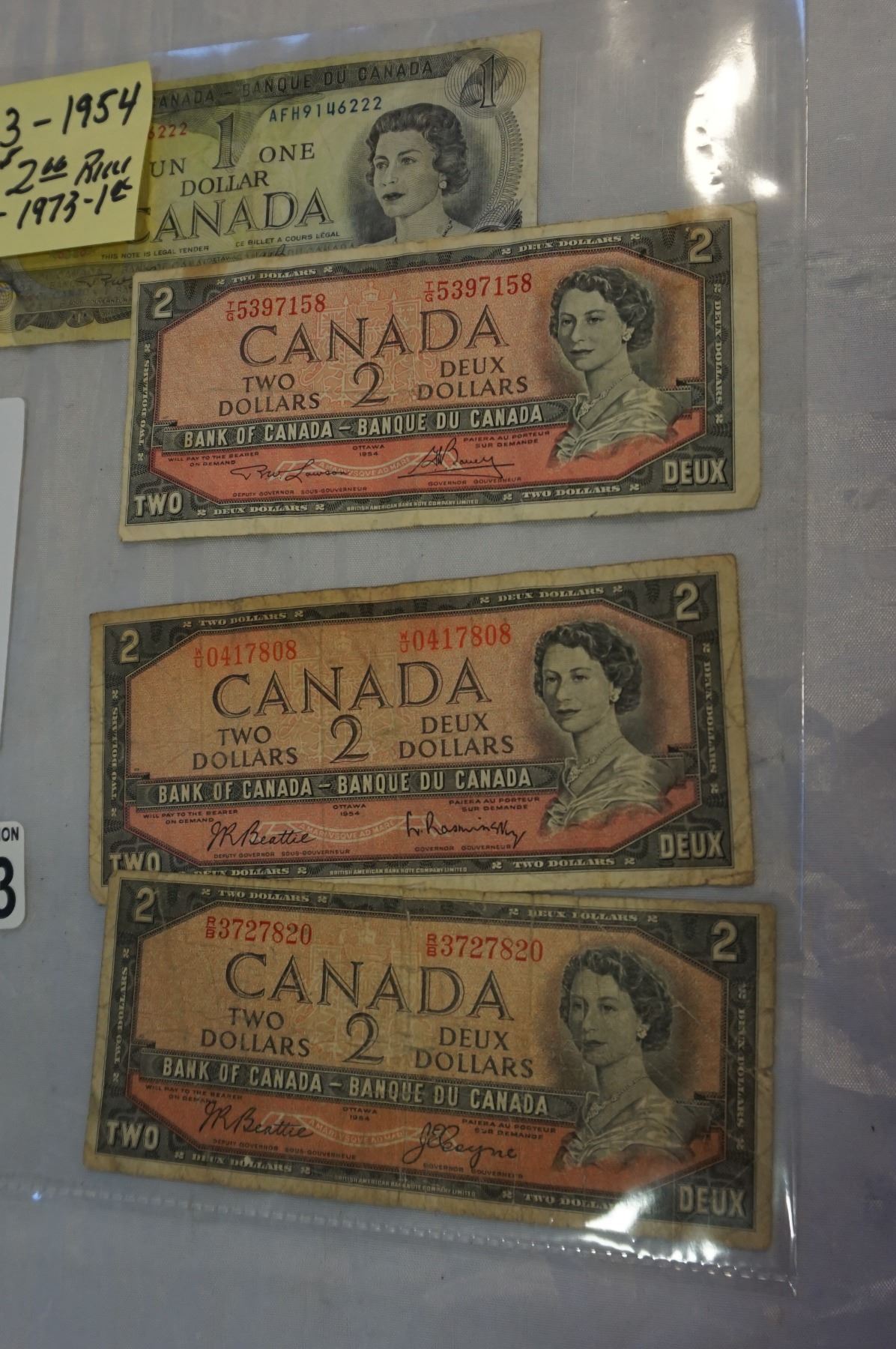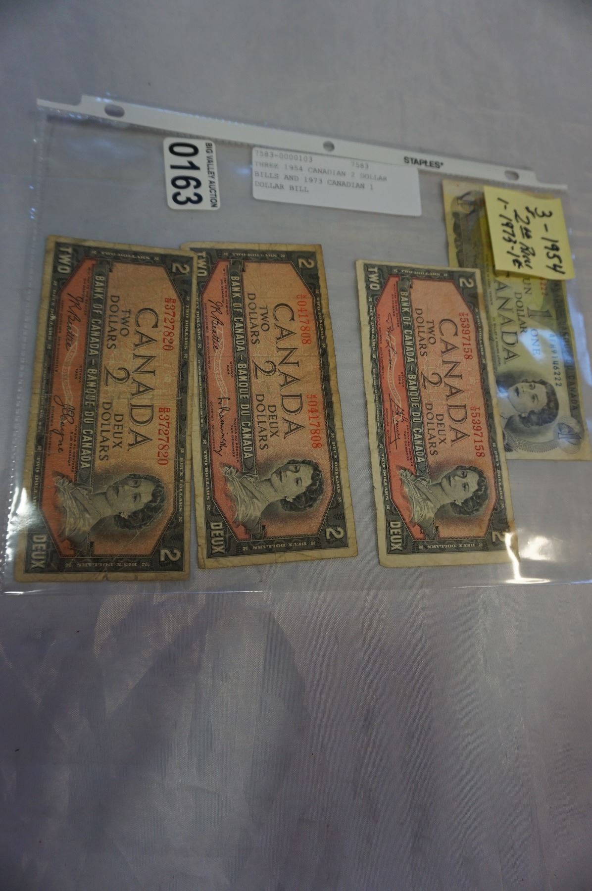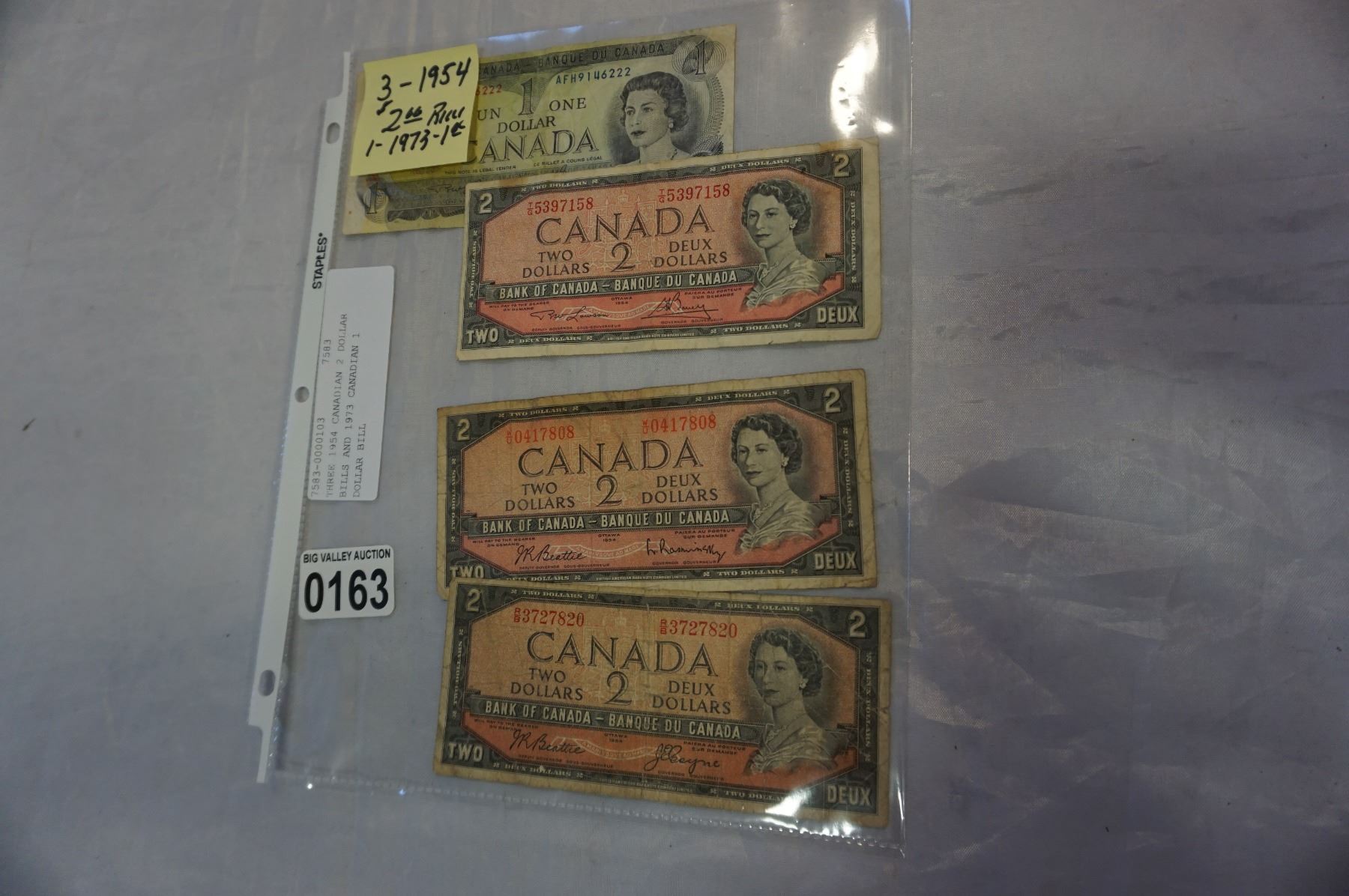 THREE 1954 CANADIAN 2 DOLLAR BILLS AND 1973 CANADIAN 1 DOLLAR BILL